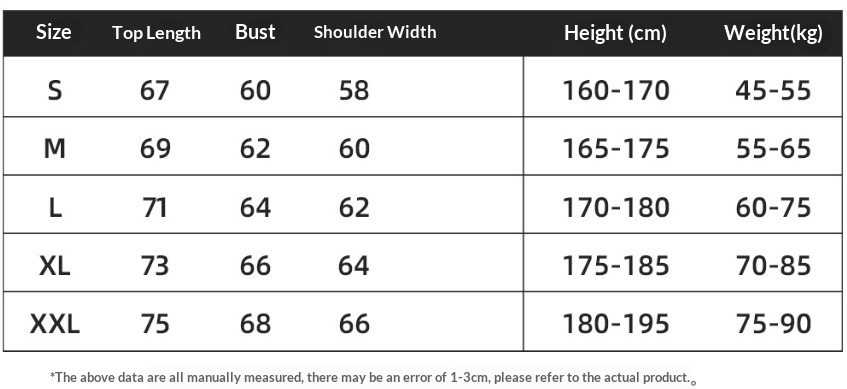 1. Asian sizes are 1 to 2 sizes smaller than European and American people. Choose the larger size if your size between two sizes. Please allow 2-3cm differences due to manual measurement. 2. Please check the size chart carefully before you buy the item, if you don't know how to choose size, please contact our customer service. 3.As you know, the different computers display colors differently, the color of the actual item may vary slightly from the following images.
