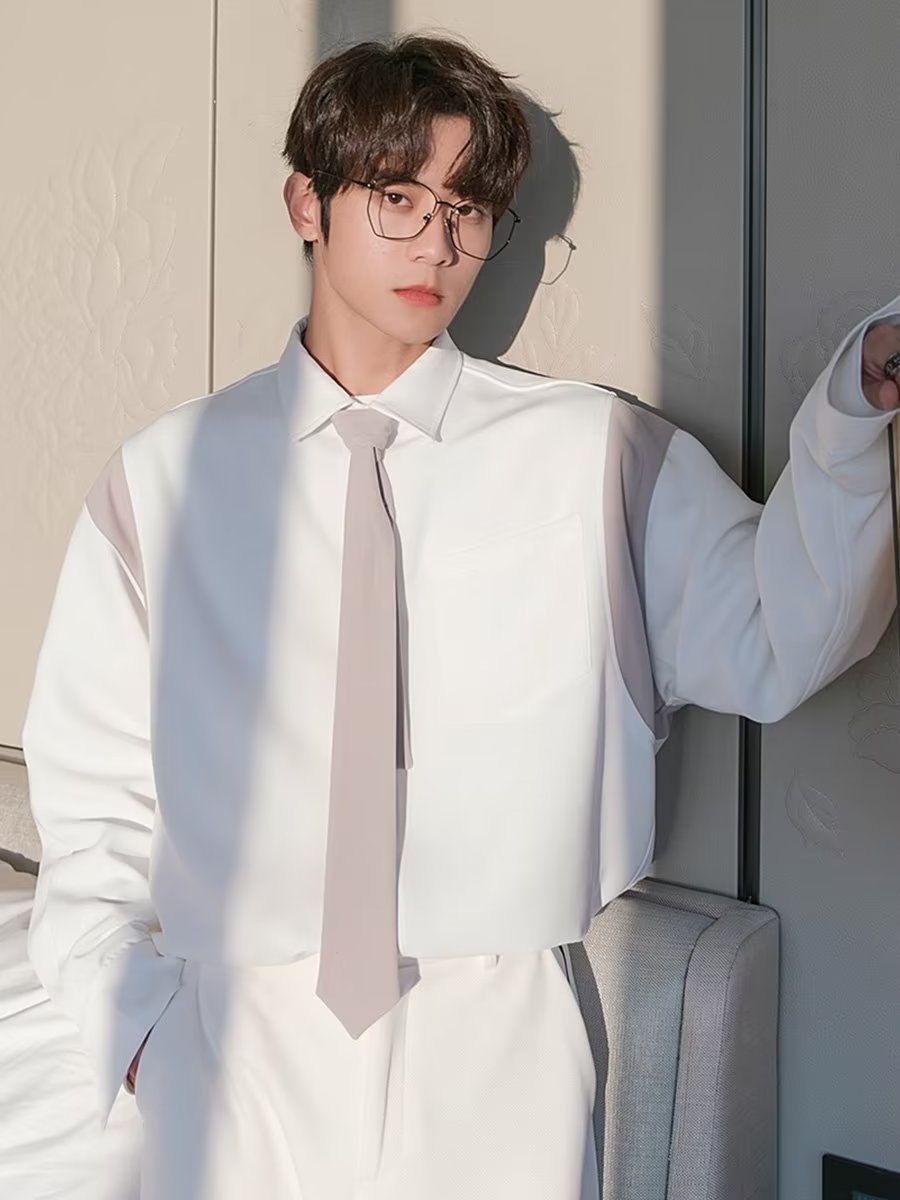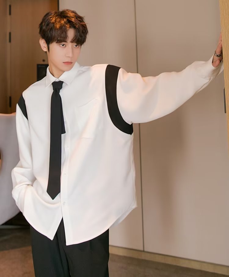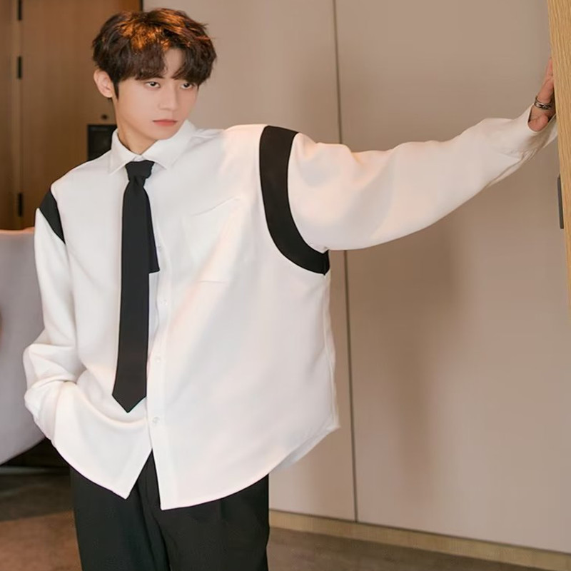 Men's Square Collar Long Sleeve Loose Contrast Color Shirt Top