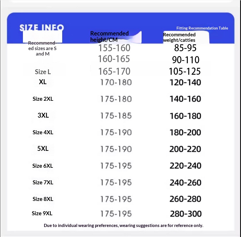 Sizes: S, M, L, XL, 2XL, 3XL, 4XL, 5XL, 6XL, 7XL, 8XL