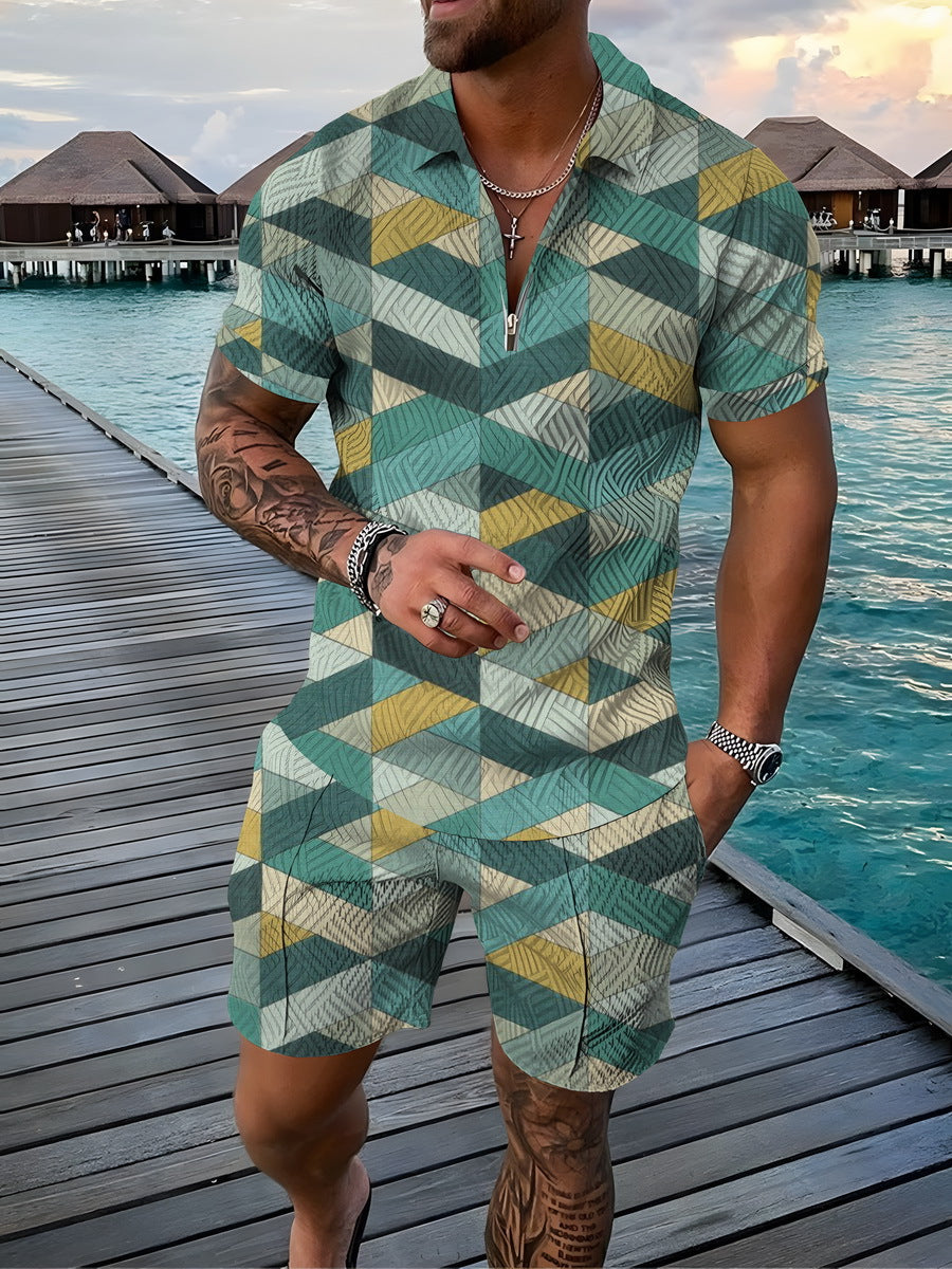 Men's Summer Fashion 3D Printed Short Sleeve Geometric Zip Lapel Shirt Set