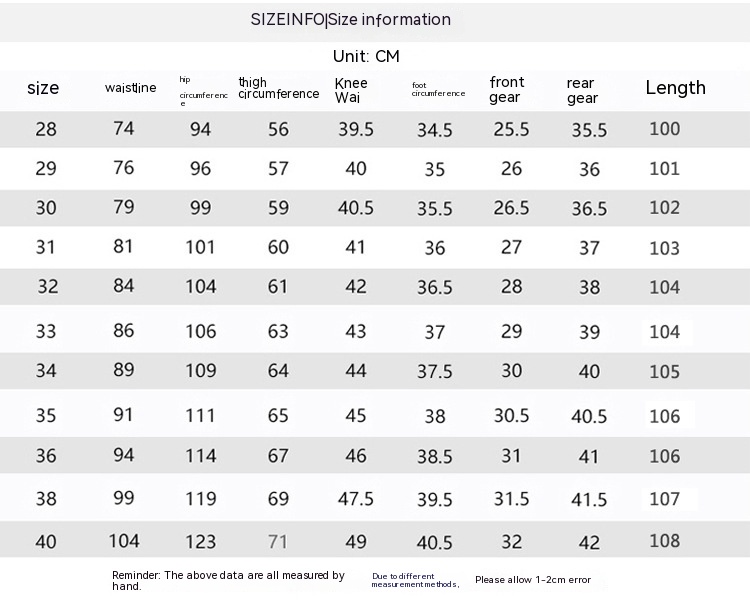 Size: 28, 29, 30, 31, 32, 33, 34, 36, 38, 40
