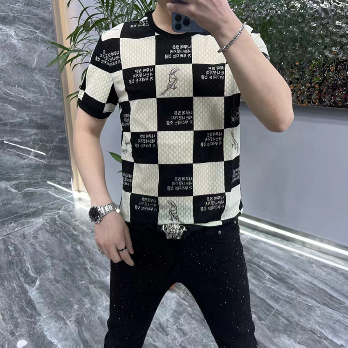 Color: black and white plaid, black and white Brown