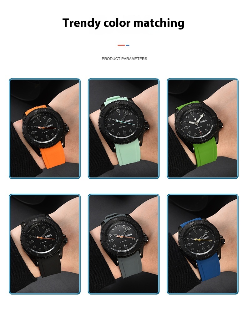Color: orange, light green, dark blue, dark green, dark gray, black