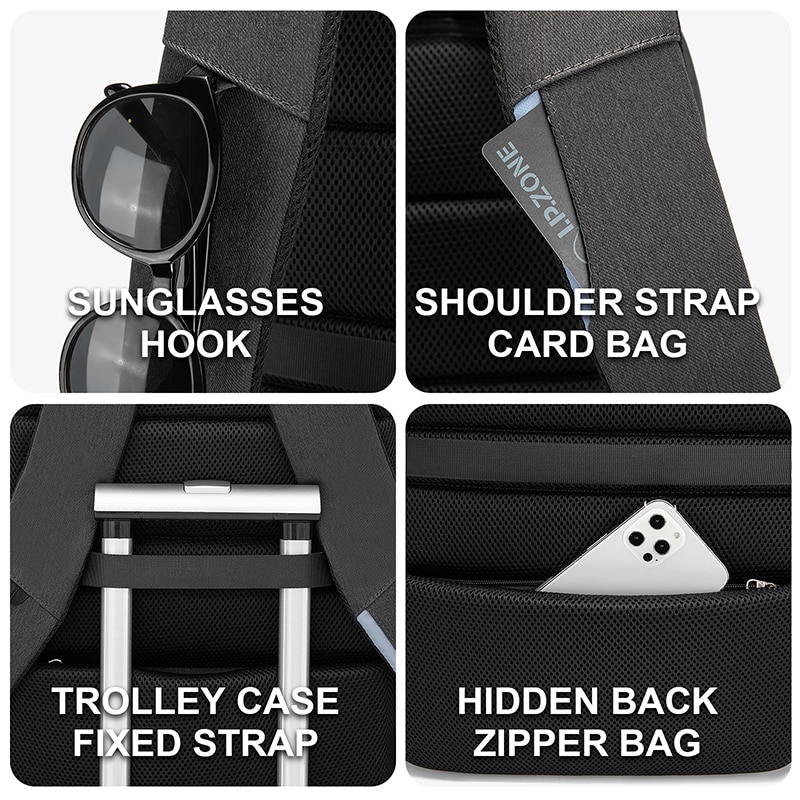 Internal structure: zipper pocket, mobile phone pocket, sandwich zipper pocket, computer pocket, main pocket