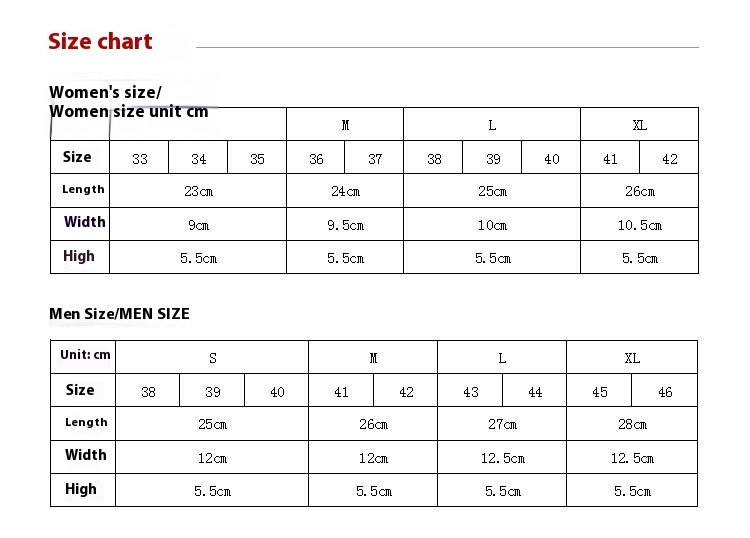 Size: 25CM (suitable size 38-40),26CM (suitable size 40-42),27CM (suitable size 42-44),28CM (suitable size 44-46)