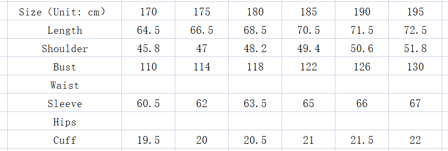 Size: 170//M, 175/L, 180/XL, 185/2XL, 190/3XL, 195/4XL