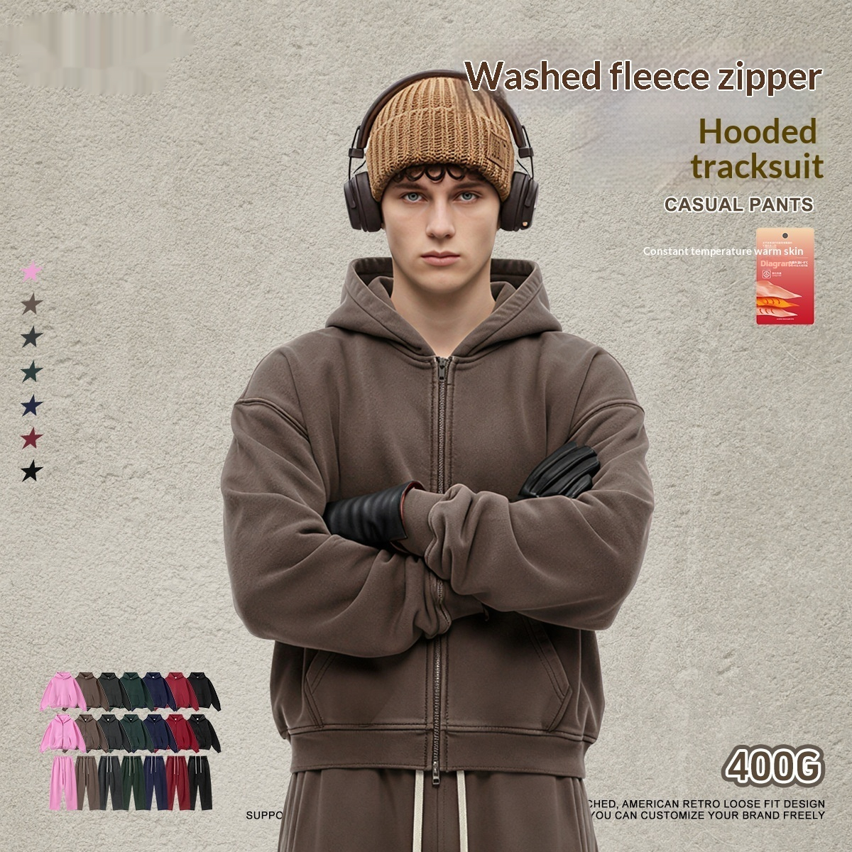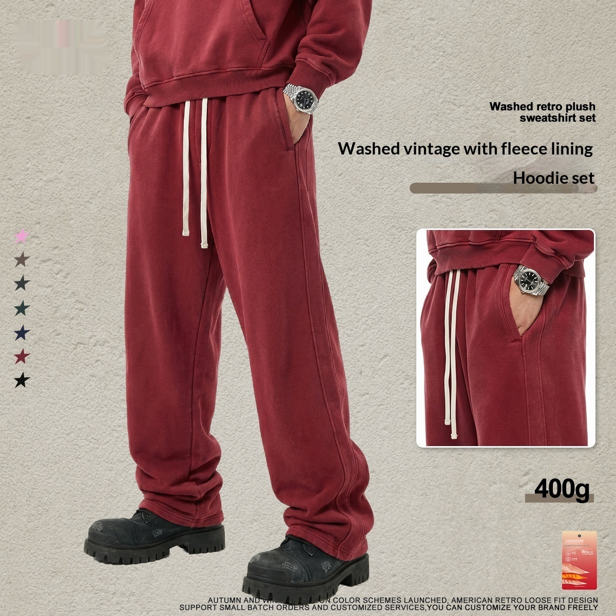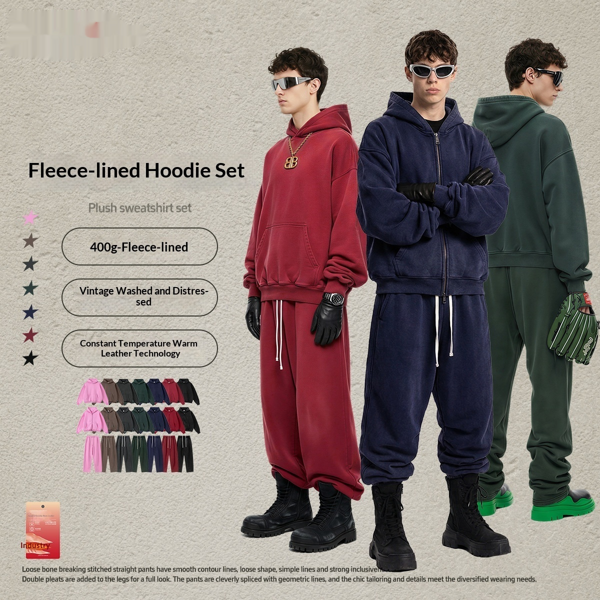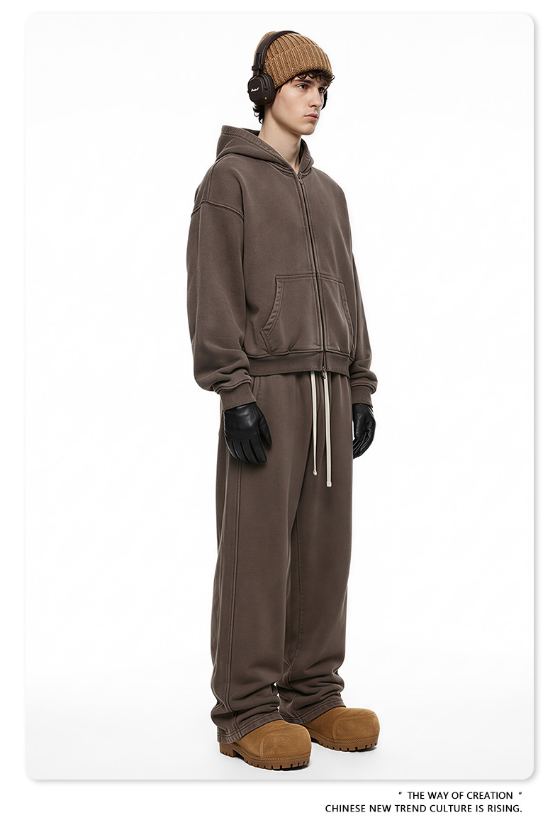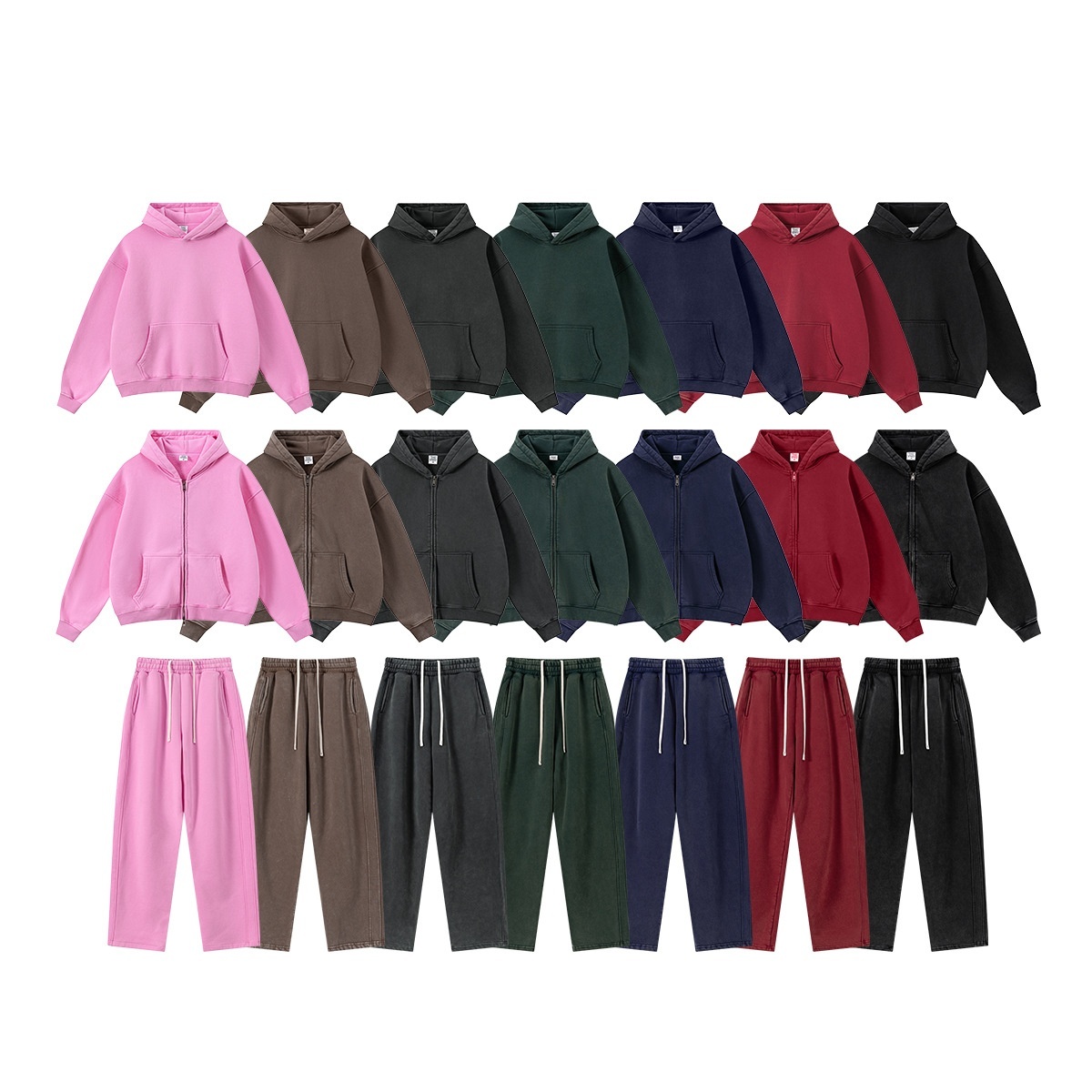 Colors: Hooded — Vintage Red, Hooded — Vintage Peach Pink, Hooded — Vintage Olive Green, Hooded — Vintage Dark Brown, Hooded — Vintage Royal Blue, Hooded — Vintage Dark Gray, Hooded — Vintage Black; Zip-up — Vintage Red, Zip-up — Vintage Peach Pink, Zip-up — Vintage Olive Green, Zip-up — Vintage Dark Brown, Zip-up — Vintage Royal Blue, Zip-up — Vintage Dark Gray, Zip-up — Vintage Black; Pants — Vintage Red, Pants — Vintage Peach Pink, Pants — Vintage Olive Green, Pants — Vintage Dark Brown, Pants — Vintage Royal Blue, Pants — Vintage Dark Gray, Pants — Vintage Black