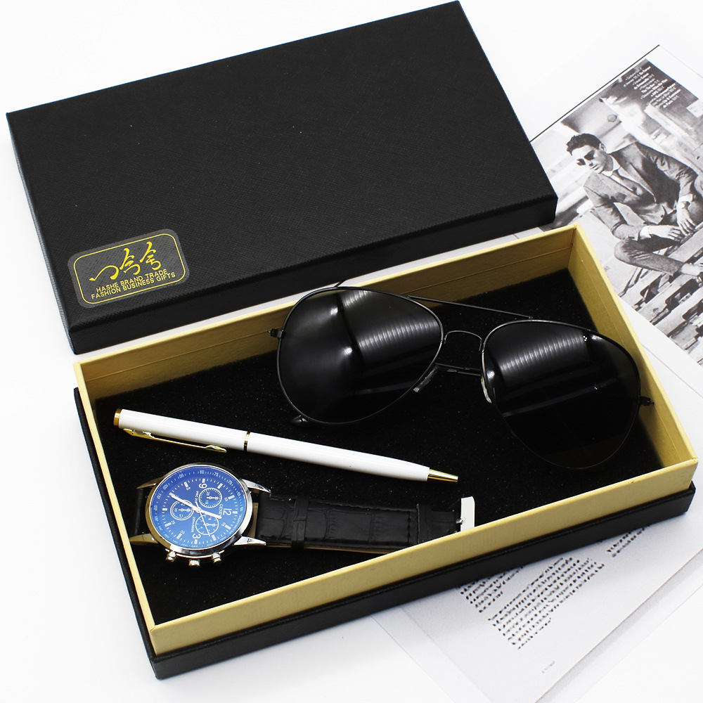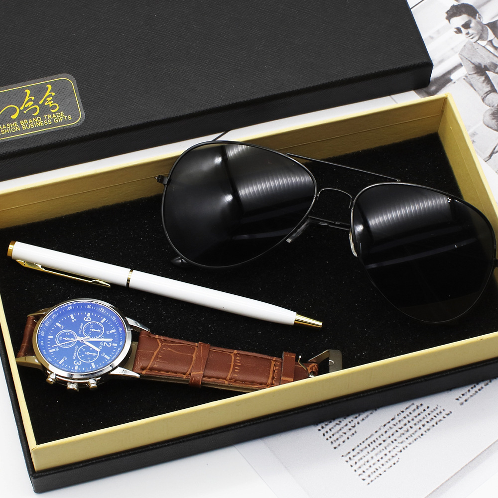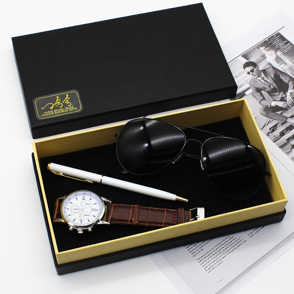 Color: Black Face Brown with watch sunglasses white business Pen gift box, white face Brown with watch sunglasses white business Pen gift box, white face black ribbon watch sunglasses white business Pen gift box, black face black ribbon watch sunglasses white business Pen gift box, black face black strap watch Sunglasses Black Business pen gift box