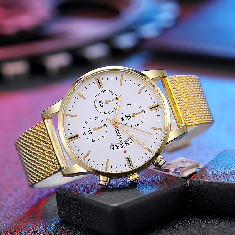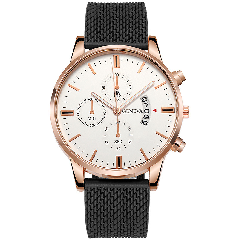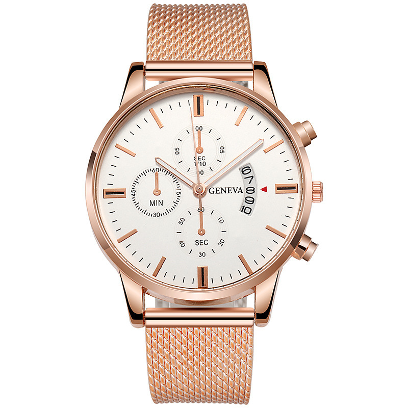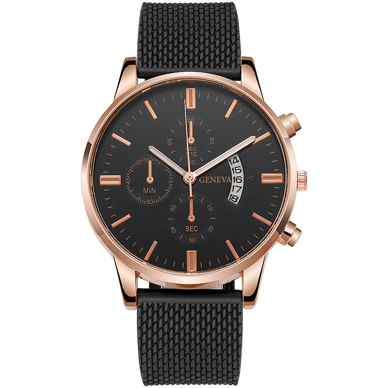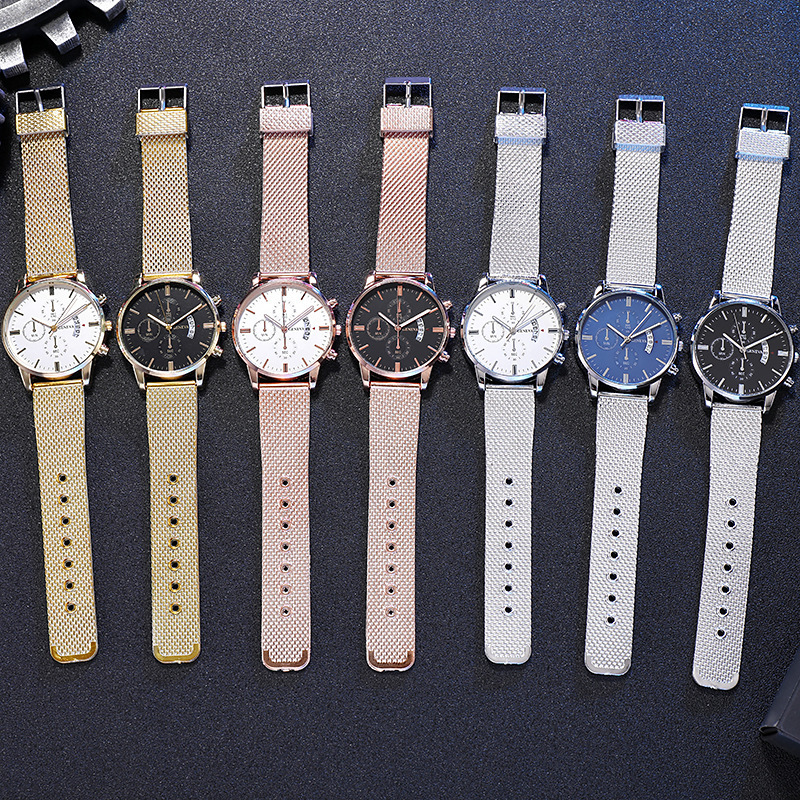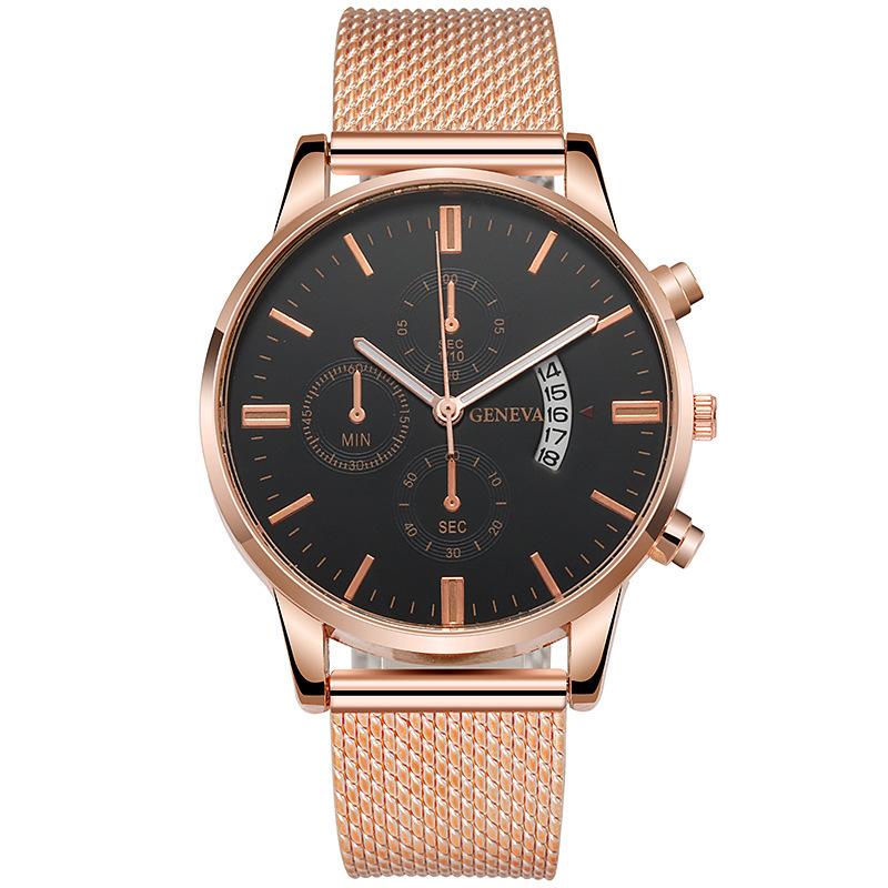 Colors: Black case, black dial, rose-gold bezel, black strap; black case, black dial, gold bezel, black strap; rose-gold case, white dial, black strap; rose-gold case, black dial, black strap; rose gold with white; rose gold with black; gold and black; gold and white; silver and blue; silver and black; silver and white; black case, black dial, silver hands, black strap.