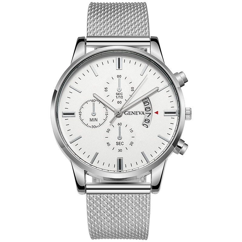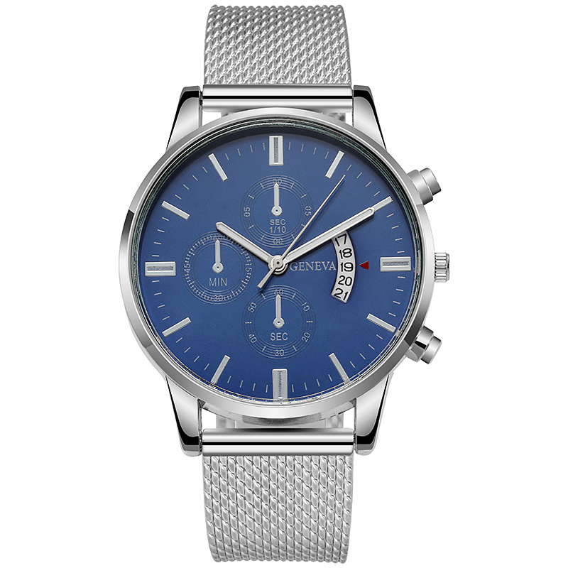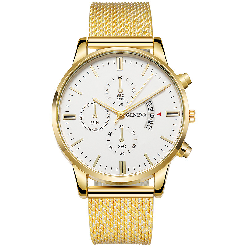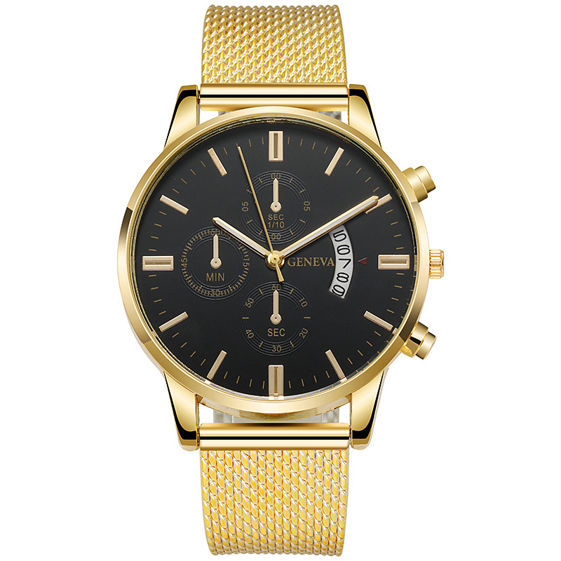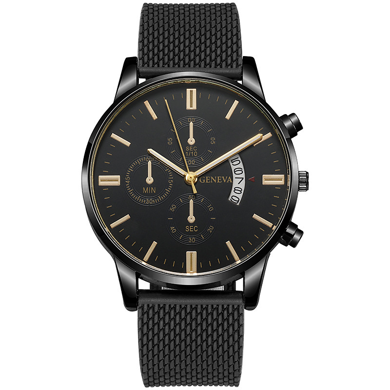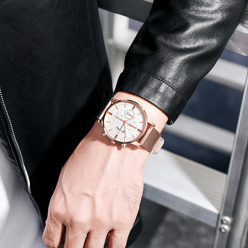 Colors: Black case, black dial, rose-gold bezel, black strap; black case, black dial, gold bezel, black strap; rose-gold case, white dial, black strap; rose-gold case, black dial, black strap; rose gold with white; rose gold with black; gold and black; gold and white; silver and blue; silver and black; silver and white; black case, black dial, silver hands, black strap.