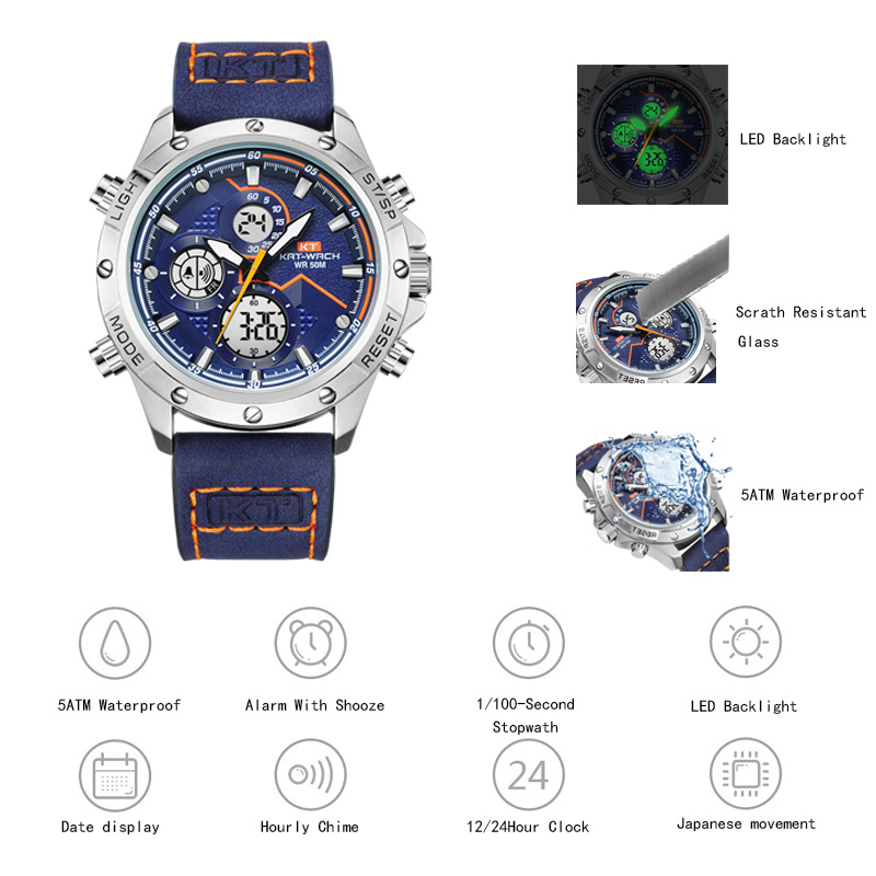 Special features: luminous, alarm, chronograph, calendar, 24-hour indication, week display, month display
