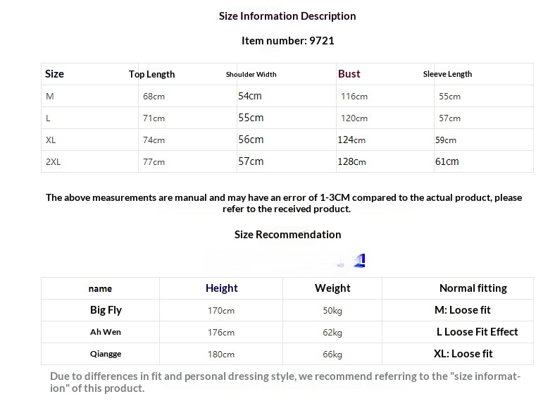 1. Asian sizes are 1 to 2 sizes smaller than European and American people. Choose the larger size if your size between two sizes. Please allow 2-3cm differences due to manual measurement. 2. Please check the size chart carefully before you buy the item, if you don't know how to choose size, please contact our customer service. 3.As you know, the different computers display colors differently, the color of the actual item may vary slightly from the following images.