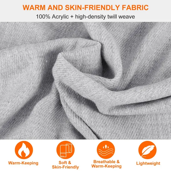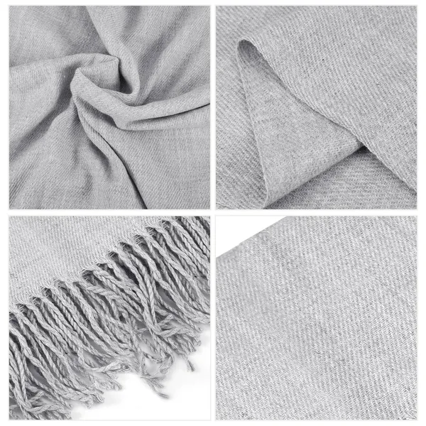 **WARM AND SKIN-FRIENDLY FABRIC*:Made from high-grade acrylic fabric with a high-density twill weave,our scarf is soft,skin-friendly,breathable,warm-keeping,lightweight and fine. You can wrap it around your neck comfortably for all day to keep warm in cold winter. **STYLISH AND GORGEOUS WRAP SHAWL*:Adopting special fancy twill weave,combining with popular braided tassels and based on never outdated solid color,our shawl is stylish and gorgeous to match your different dressing to make you fashionable among your friends. **79" X 28" OVERSIZE*:Wide and long enough to be used as shawl,head wrap,hijab,stole and scarves. No matter which wearing method you choose,our pashmina will warm your body and dress up your outfits. **WIDE OCCASIONS AND UNIVERSAL FITS*:Can be used as daily wearing or in the party of Thanksgiving Day,Christmas Day,Birthday,Mother’s Day,Wedding or romantic encounter as a beautiful complement to a guest’s formal outfit to keep your girls and guests warm in case they get cold. And coming with 5 selectable colors(light gray,gray,dark gray,navy blue and khaki),our 79" x 28" oversize scarf can fit women and men,the young and the elderly. **GREAT GIFT*:Our warm,comfortable and easy-to-match scarf can not only help you drive away the cold in winter,but also can match your different dressing to make you fashionable and elegant. And it is a perfect gift for your lovers,parents,friends and colleagues. *Specifications*: