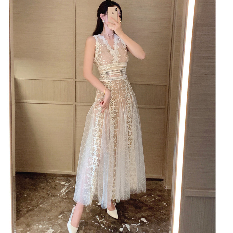 Mesh Embroidered Waistband White Dress