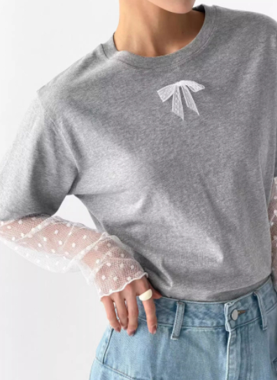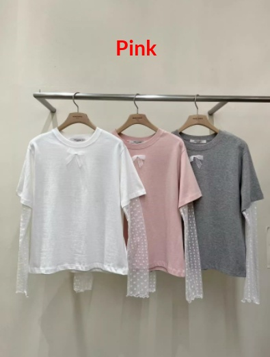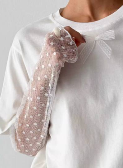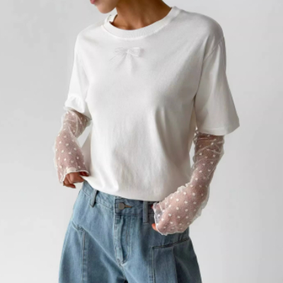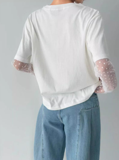 Mesh Polka-Dot Sleeve Panel Long-Sleeve T-Shirt