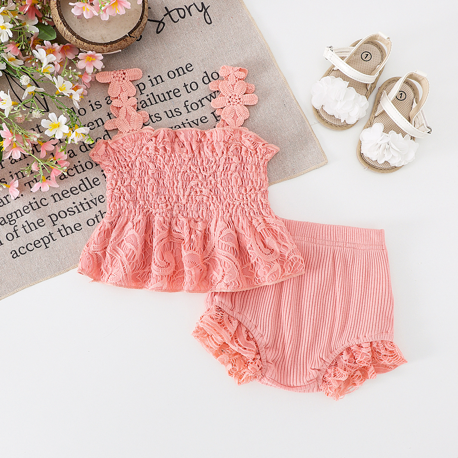 Mesh Smocking Sling Top Harem Pants Lace Two-piece Set