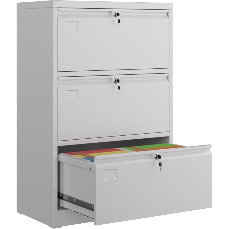 Metal 3 Drawer Lateral File Cabinet With 3 Lock - Wide Filing Cabinet For Letter Legal F4 A4 Hanging Files - Includes Business Card Holder,Home Office School Storage,White