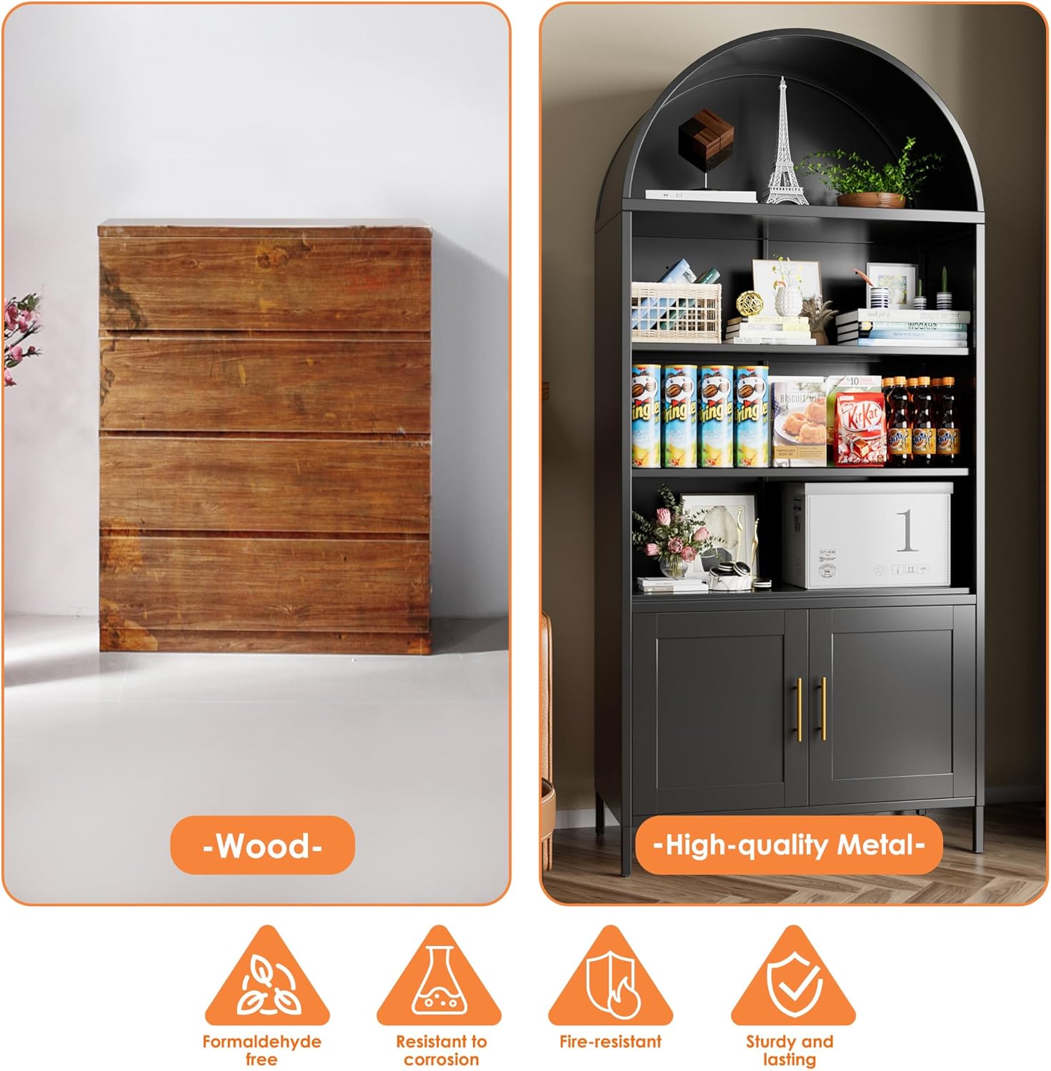 Cleaning and Durability - The tall black arched cabinet are constructed from high-density metal, providing excellent stability and durability. With a 4.8-inch clearance between the bottom of the pantry cabinet and the floor, you can easily access and clean underneath, making maintenance simple. This thoughtful design helps keep your kitchen tidy and streamlines your cleaning routine.