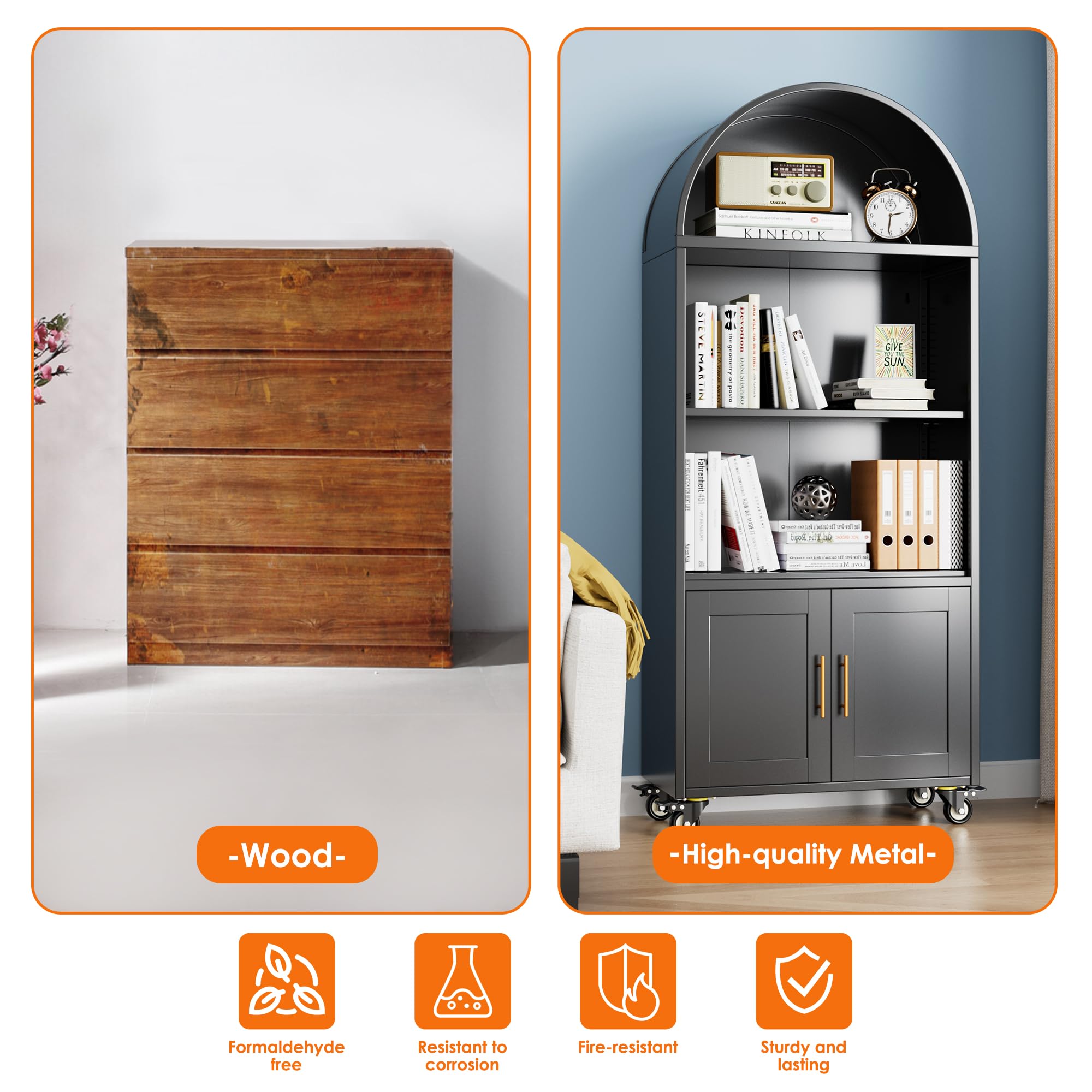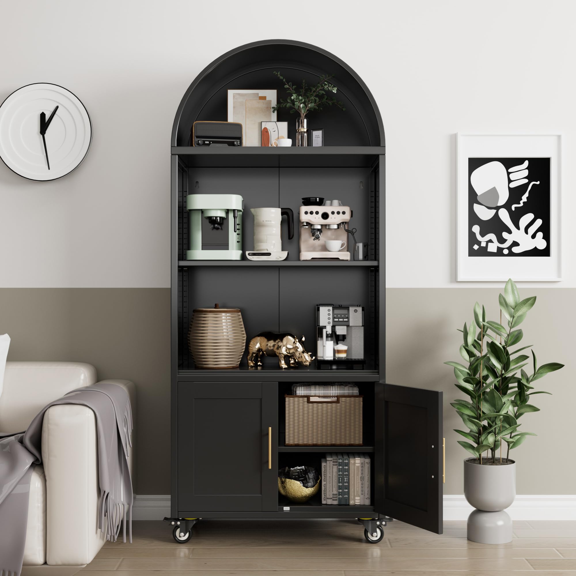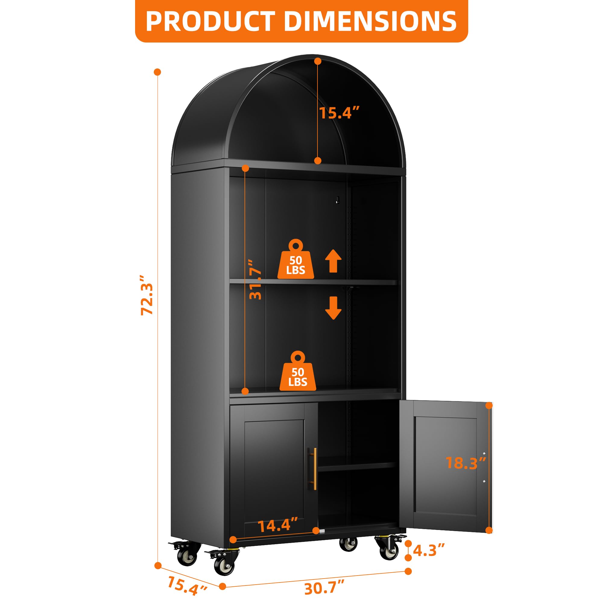Cleaning and Durability - The arched bookcase with doors are constructed from high-density metal, providing excellent stability and durability. With a 4.8-inch clearance between the bottom of the pantry cabinet and the floor, you can easily access and clean underneath, making maintenance simple. This thoughtful design helps keep your kitchen tidy and streamlines your cleaning routine.