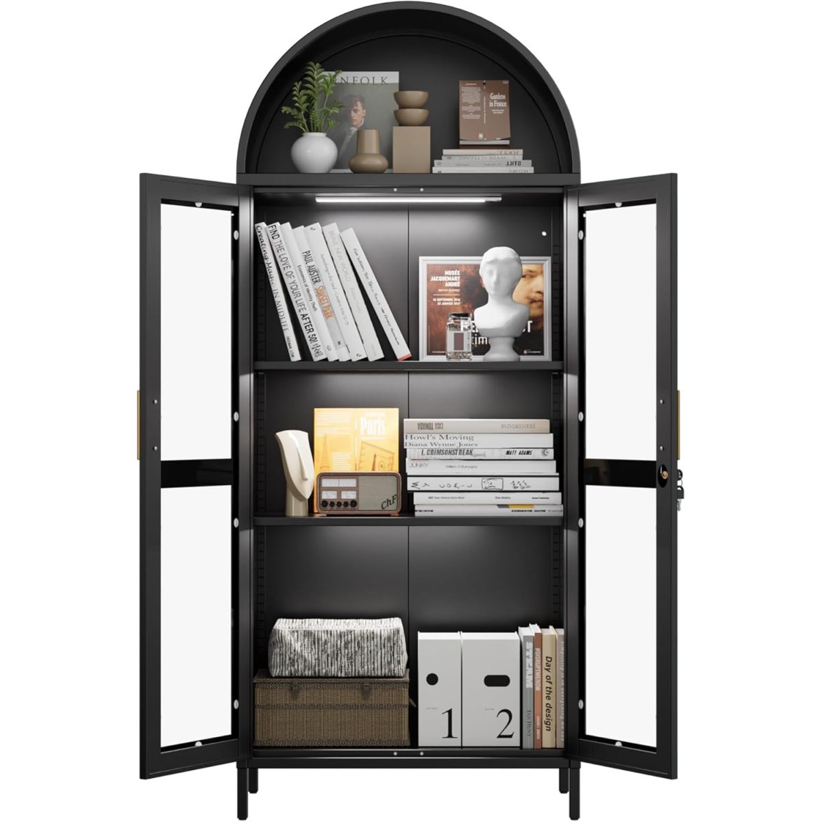 • Visible and Luminated - The door of the arched bookcase is made of glass, which allows you to see the items stored inside through the outside, making it easy to find and store. New Upgrade arch storage cabinet includes three magnetic intelligent sensing LED light strips with customizable colors to set the perfect mood.