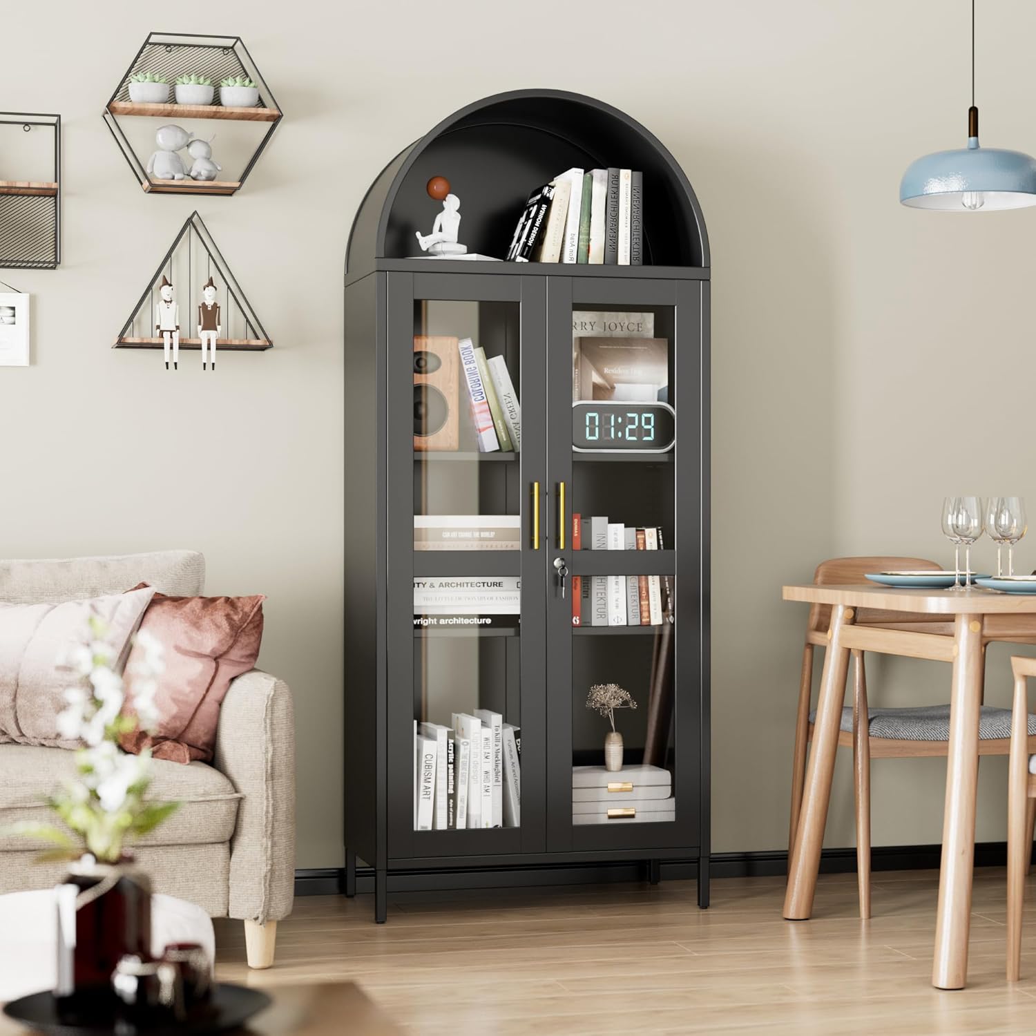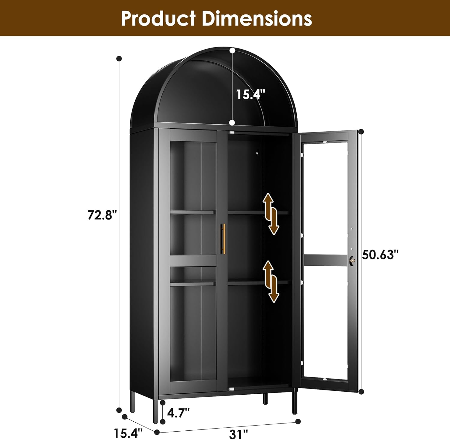 Metal Arched Cabinet With Lock, Arch Display Bookcase With Glass Doors Shelves, Modern Freestanding Kitchen Pantry Storage Cabinet For Dining Room, Home, Office, Assembly Required Black