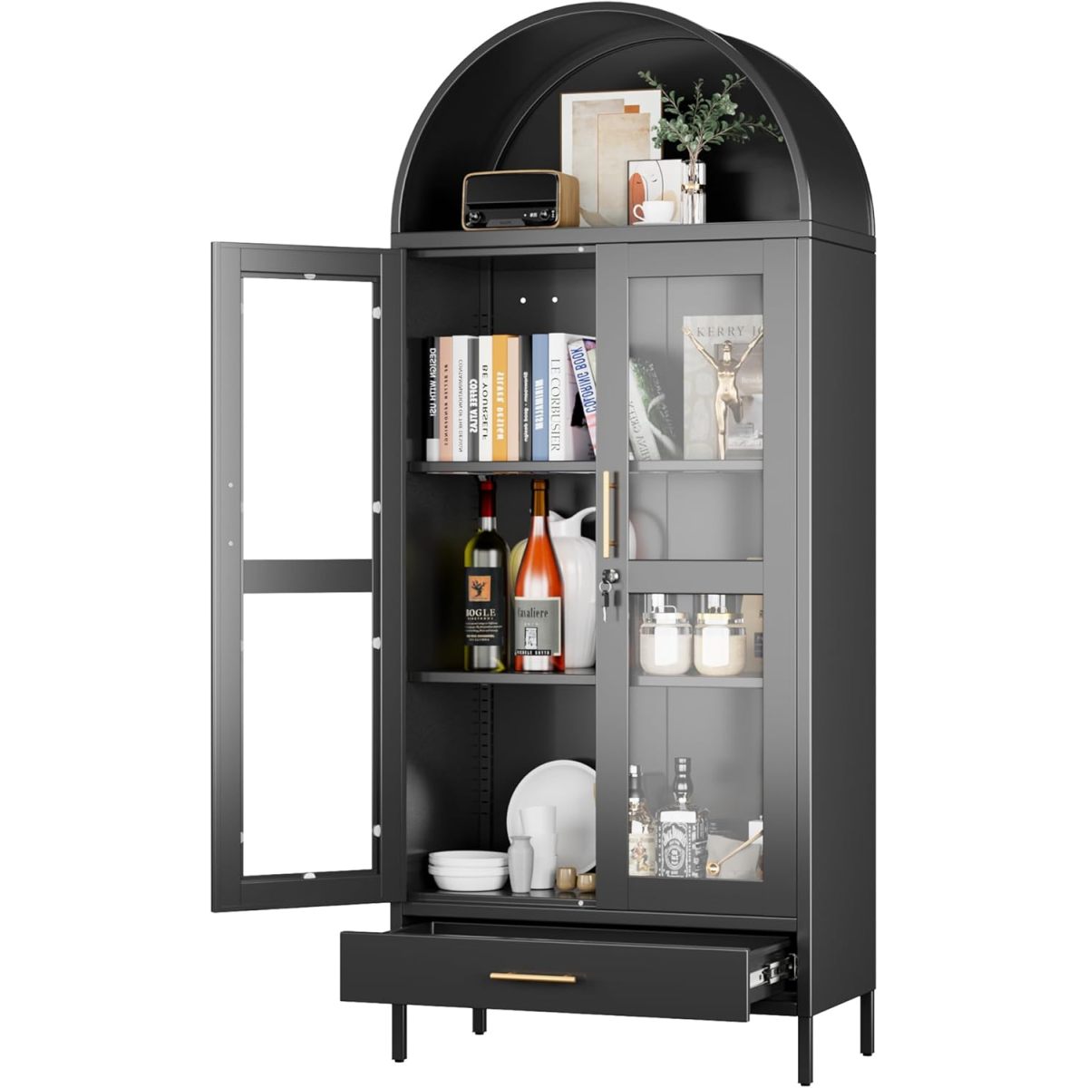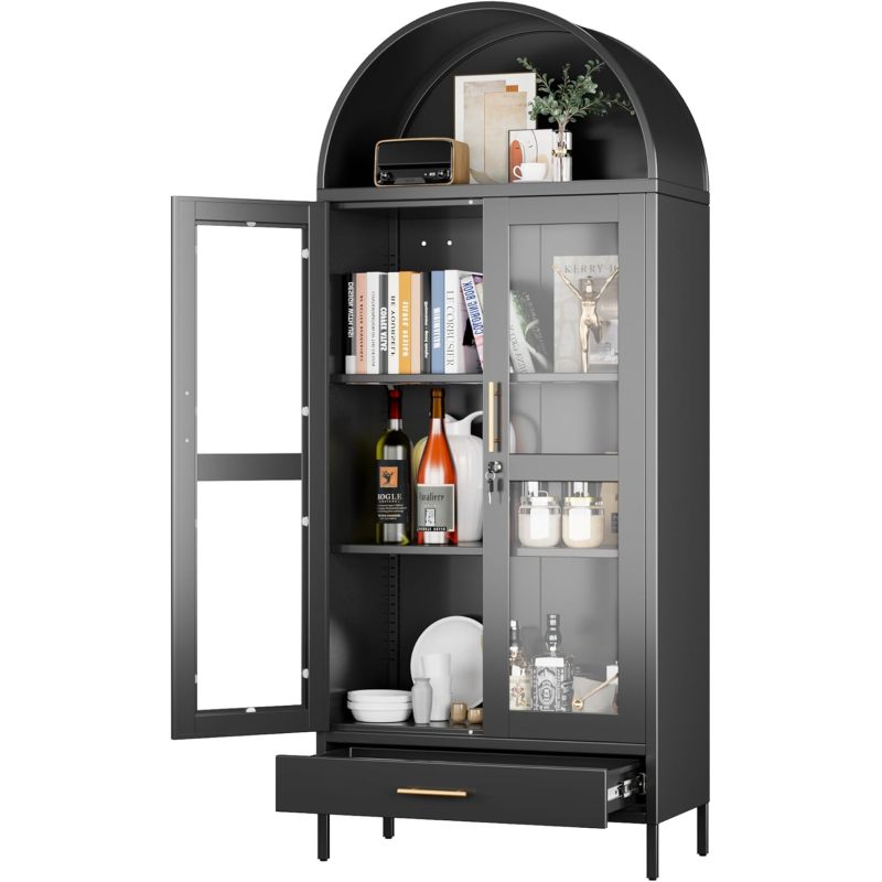 Metal Arched Display Cabinet With Lock, Modern Arch Kitchen Pantry Storage Cabinet With Glass Doors 1 Drawer For Living Room, Bookshelf, Assembly Required Black