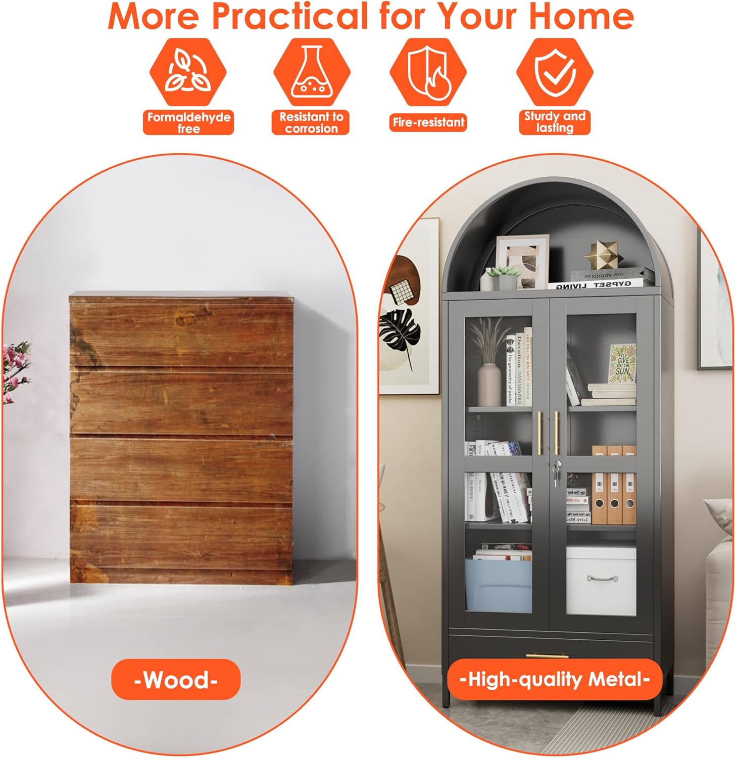 Advanced Glass Door - Metal arched cabinet with glass doors not only offers a clear view of the items inside, eliminating the need to open it, but it also enhances the decor of any room. It is perfect for showcasing your prized possessions while providing functional storage solutions.