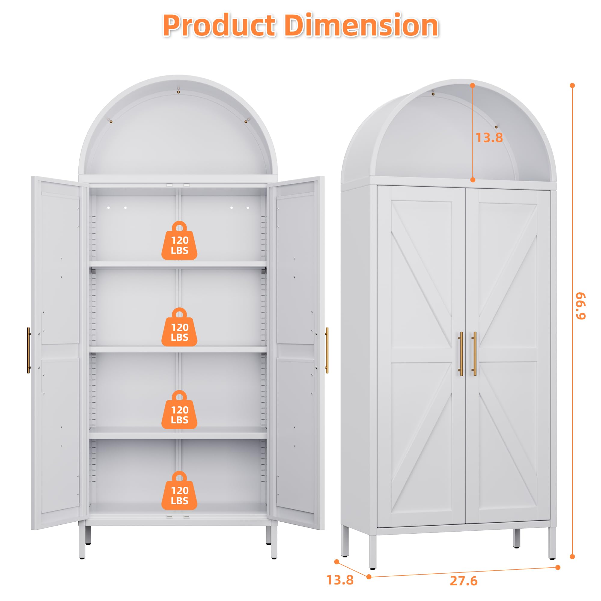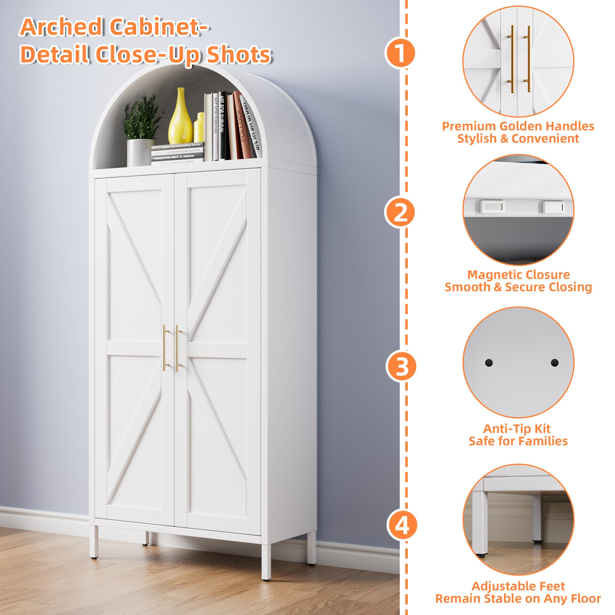 Ample Storage Space - The arched kitchen cabinet measures 66.9"H x 27.6"W x 13.8"D, providing generous storage capacity. This tall arched pantry cabinet with doors features four removable shelves with adjustable heights, allowing you to customize the storage space to meet your needs.