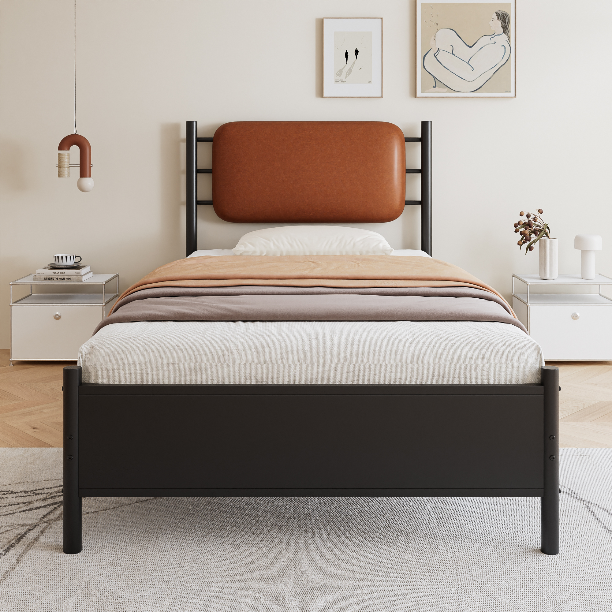 Product Name:Metal bed, 3FT single bed 90x190cm, With a PU-upholstered headboard, Durable and Sturdy, Youth bed, for adults & teenagers, Wrought iron bed, Black Iron+PU