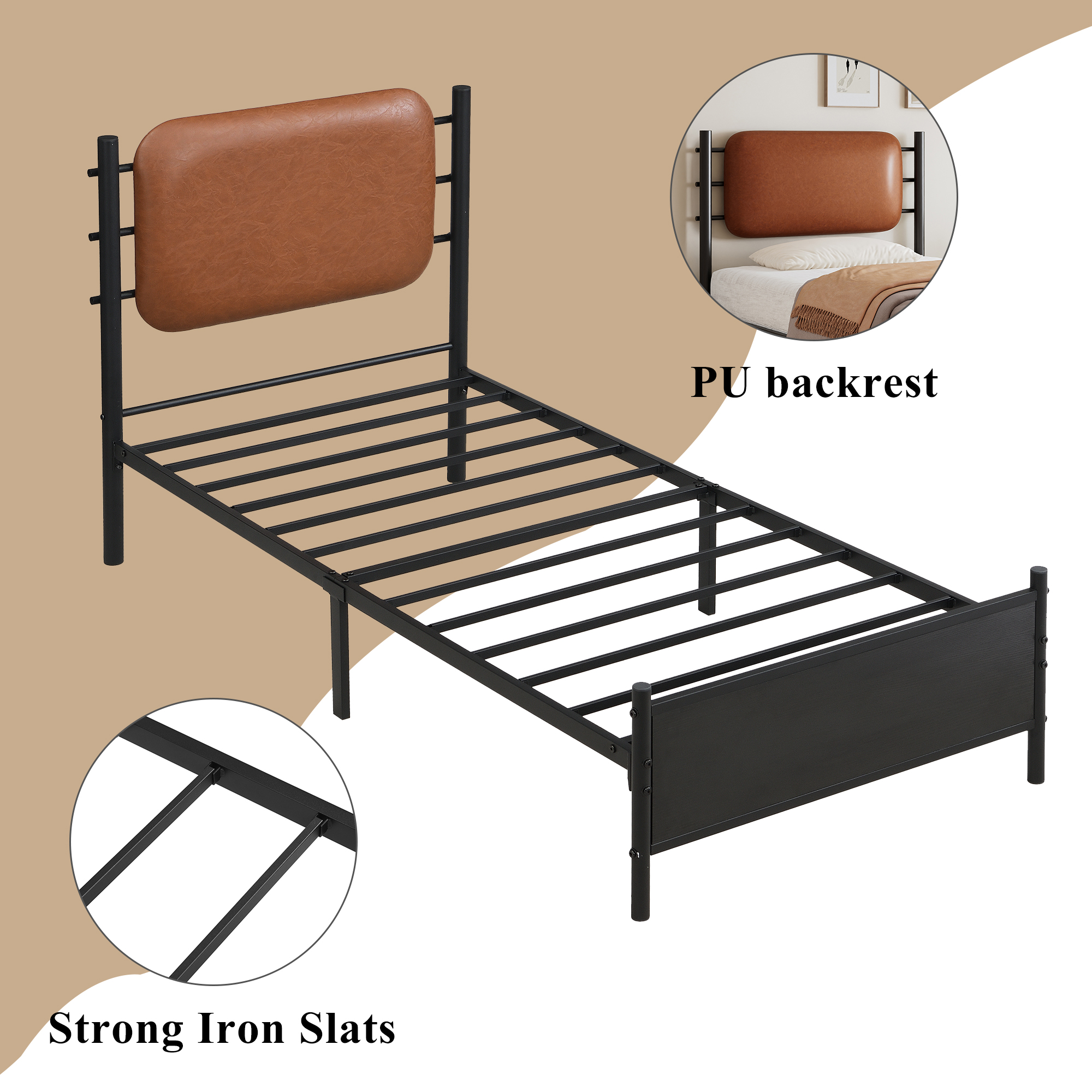 1.Iron bed slats, sturdy and durable 2.Comfortable PU headboard 3.Easy-to-clean PU headboard 4.Suitable for most bedroom styles 5.Easy to install