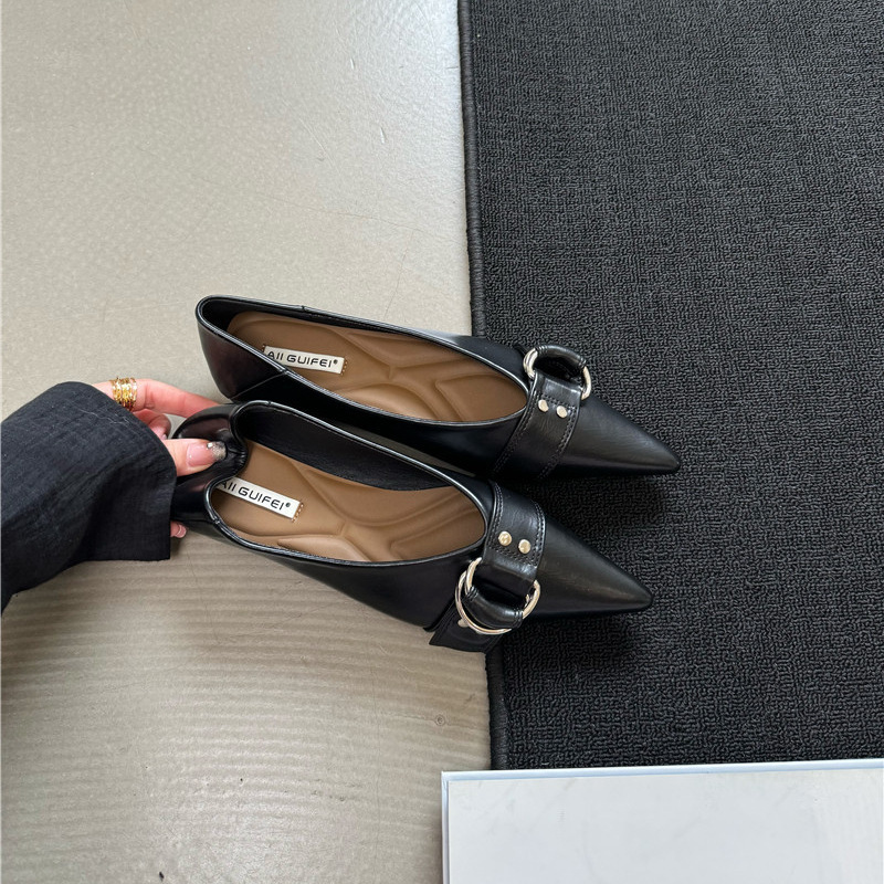 Metal Belt Buckle Soft Bottom Granny Shoes French Pointed Flat Bottom Pumps