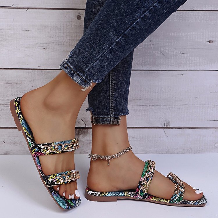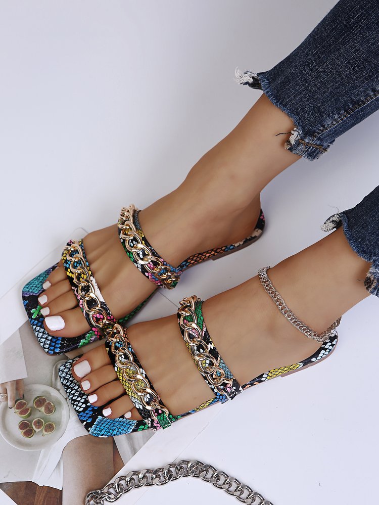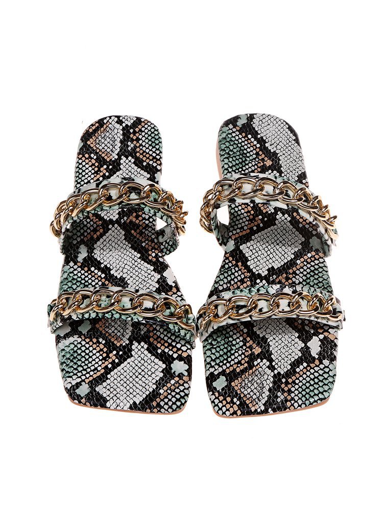 Metal Chain Buckle Snake Print Sandals And Slippers