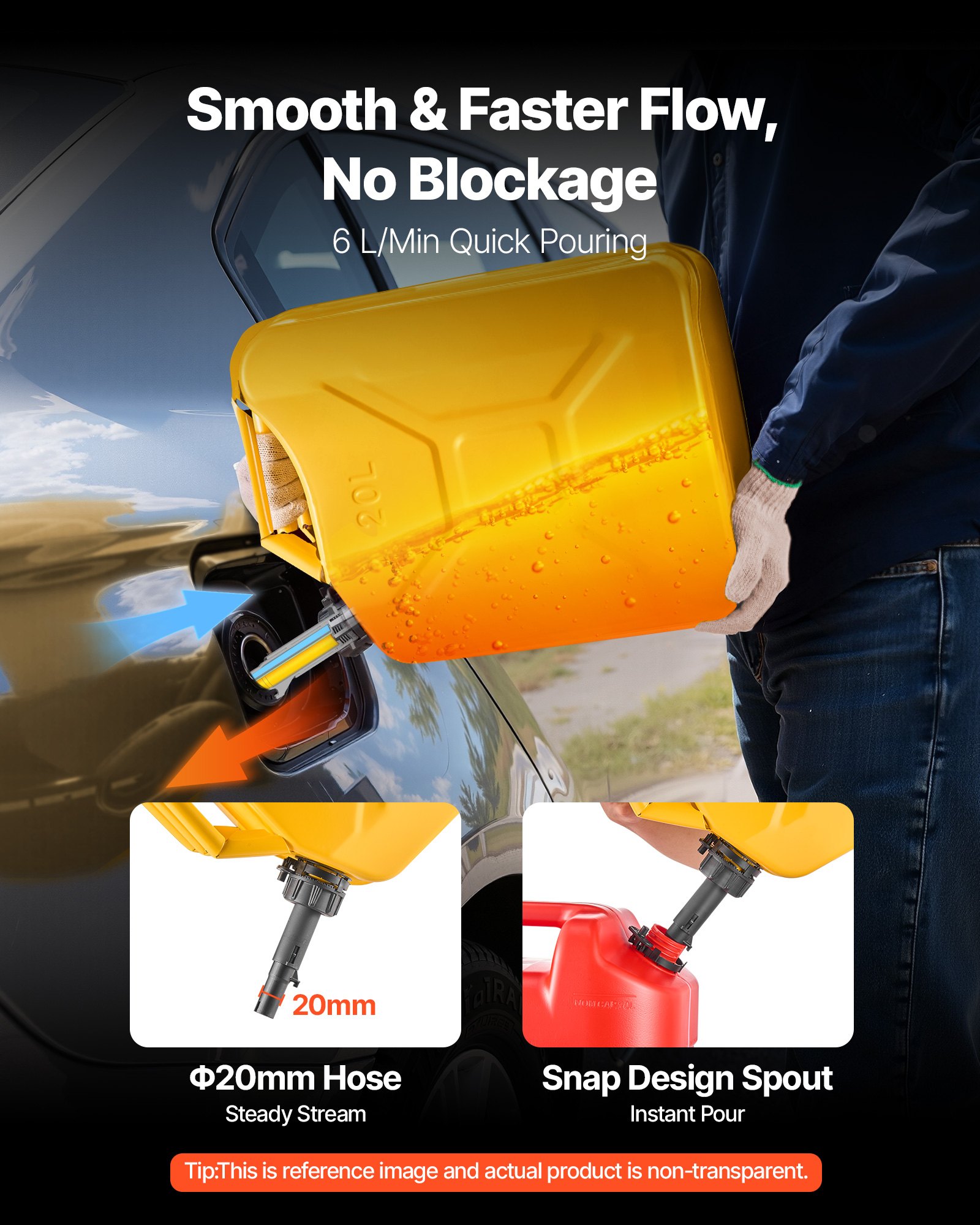 Smooth 6 L/min Fast Flow: Hate slow, messy refills? This metal jerry can delivers up to 6 L/min with a wide 20 mm hose and snap spout, giving you smooth, splash-free pours without the annoying "glug"