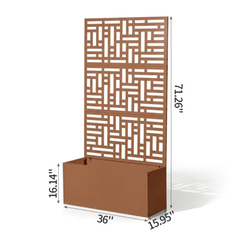 Specifications: 1. Material: Metal 2. Overall Dimensions: (35.8 x 16.1 x 70.5) in / (91 x 41 x 179) cm 3. Planter Box Dimensions: (35.8 x 16.1 x 15.7) in / (91 x 41 x 40) cm 4. Trellis Dimensions: (35.8 x 0.8 x 55.1) in / (91 x 2 x 140) cm 5. Interior Planter Box Dimensions: (34.3 x 14.6 x 14.6) in / (87 x 37 x 37) cm 6. Each Trellis Section Height: 18.3 in / 46.5 cm