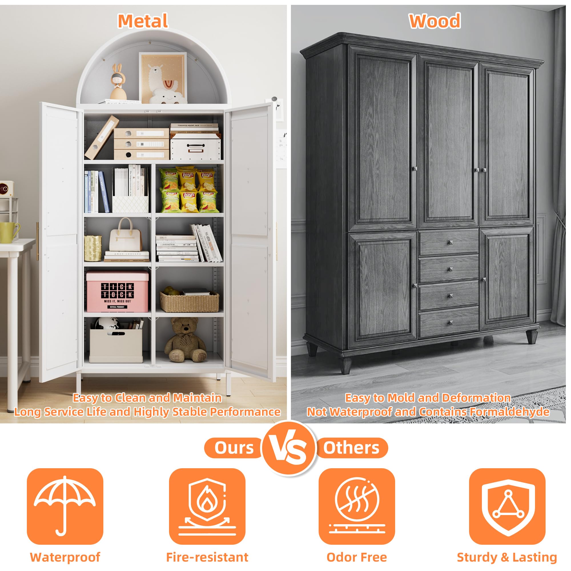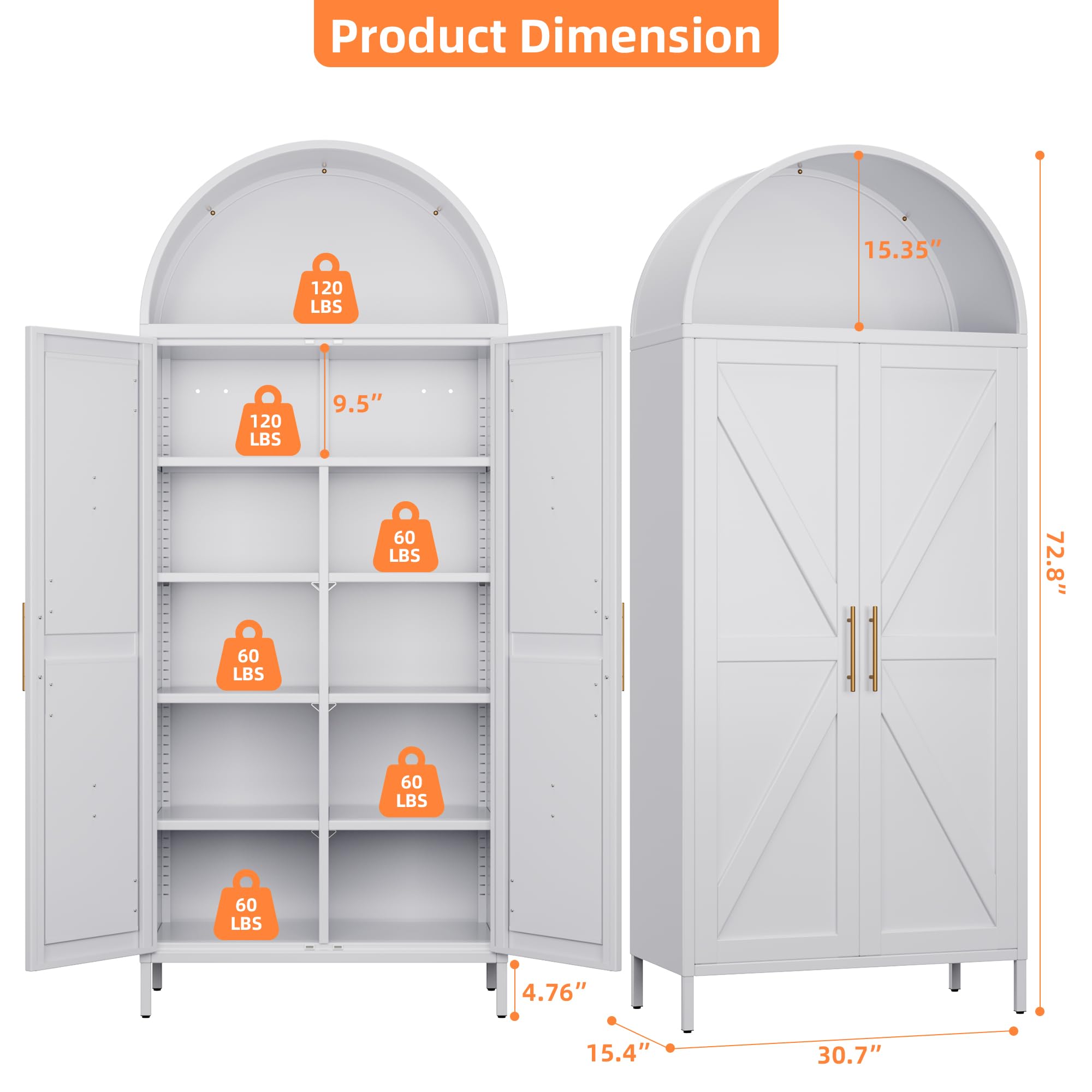 Metal Kitchen Pantry Storage Cabinet, Arched Bookcase With 6 Adjustable Shelves For Kitchen Living Room,White,Required Assembly
