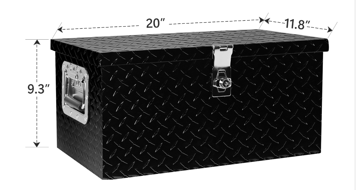 Product Name:20 Inch Black Aluminum Tool long Box Tread Flat box for Truck Car Outdoor Trailer Pickup Underbody RV ATV Storage Tools Organizer with Lock Side Handle and Keys (20.1"×11.8"×9.3")