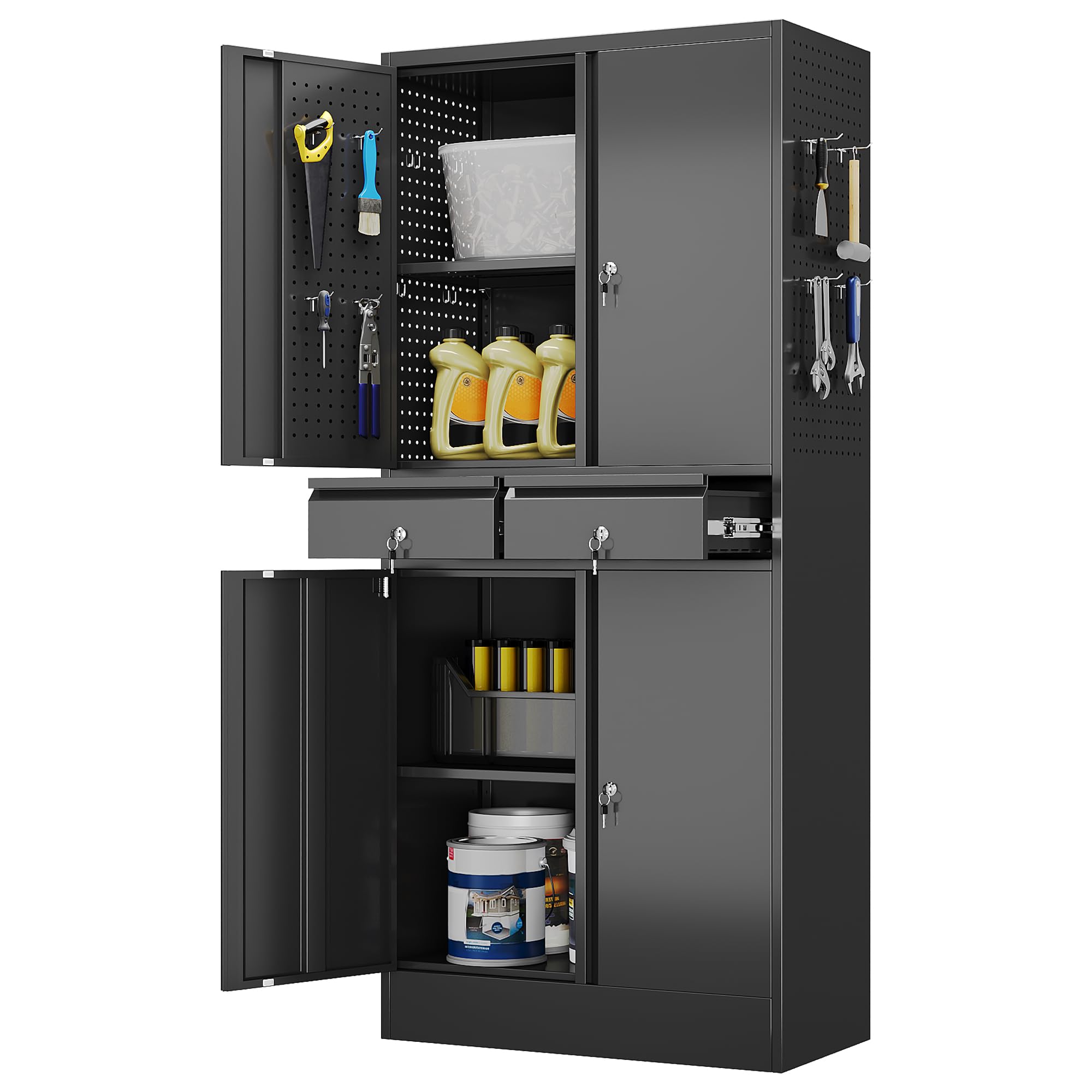 Metal Storage Cabinet With 2 Drawers And Pegboard, Garage Storage Cabinet With Locking Doors And 2 Adjustable Shelves, 71inch H Steel Cabinets For Garage, Home, Office, School, Black