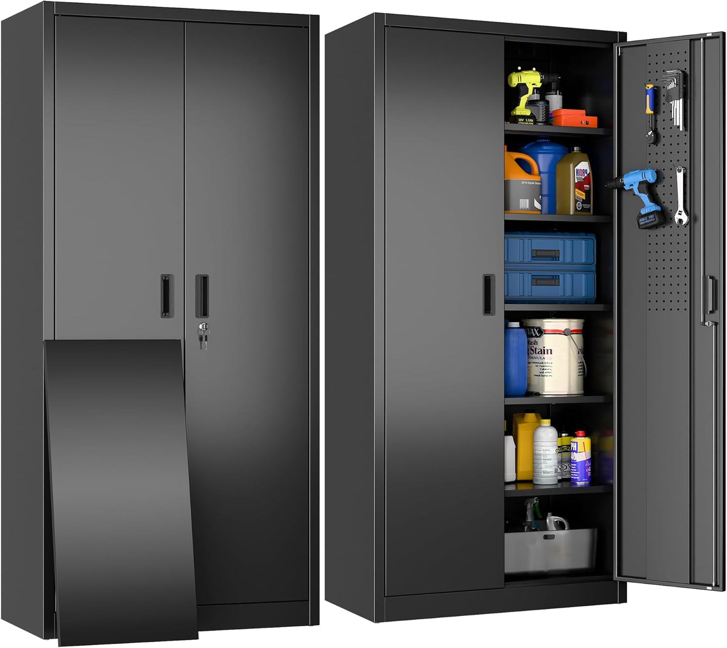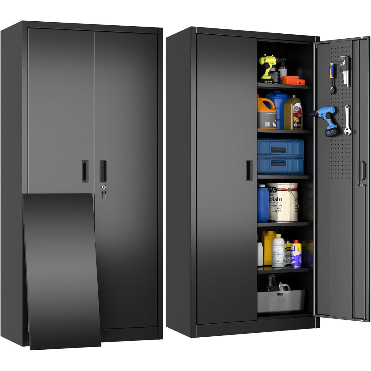 Metal Storage Cabinet With Pegboard ,Lockable Steel Storage Cabinet With 5 Adjustable Shelves And Door For Garage, Office, Kitchen, Assembly Required Black