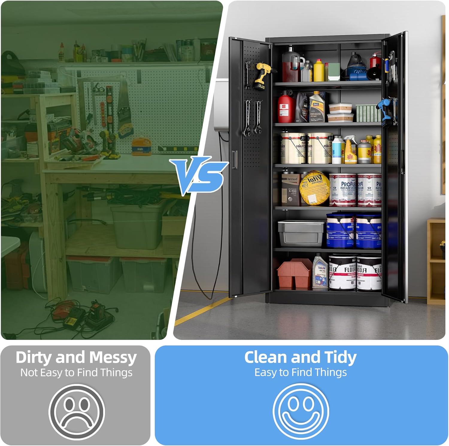 New Upgrade:Metal Cabinet has lots of room to organize your belongings.In order to meet customer storage requirements, the newly upgraded metal cabinet with Pegboard(Including 4 hooks) for storing tools and other items, fully utilizing space