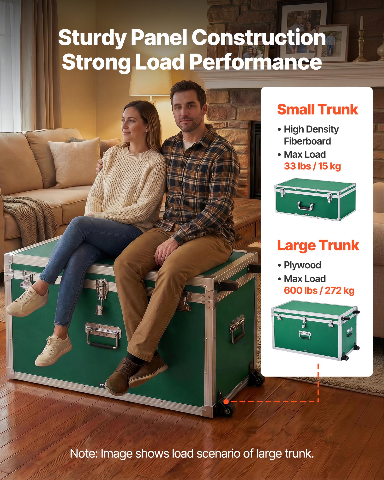 Durable Panel Construction: This large trunk made of plywood panels; maximum load 600 lbs / 272 kg; small trunk made of fiberboard panels; maximum load 33 lbs / 15 kg