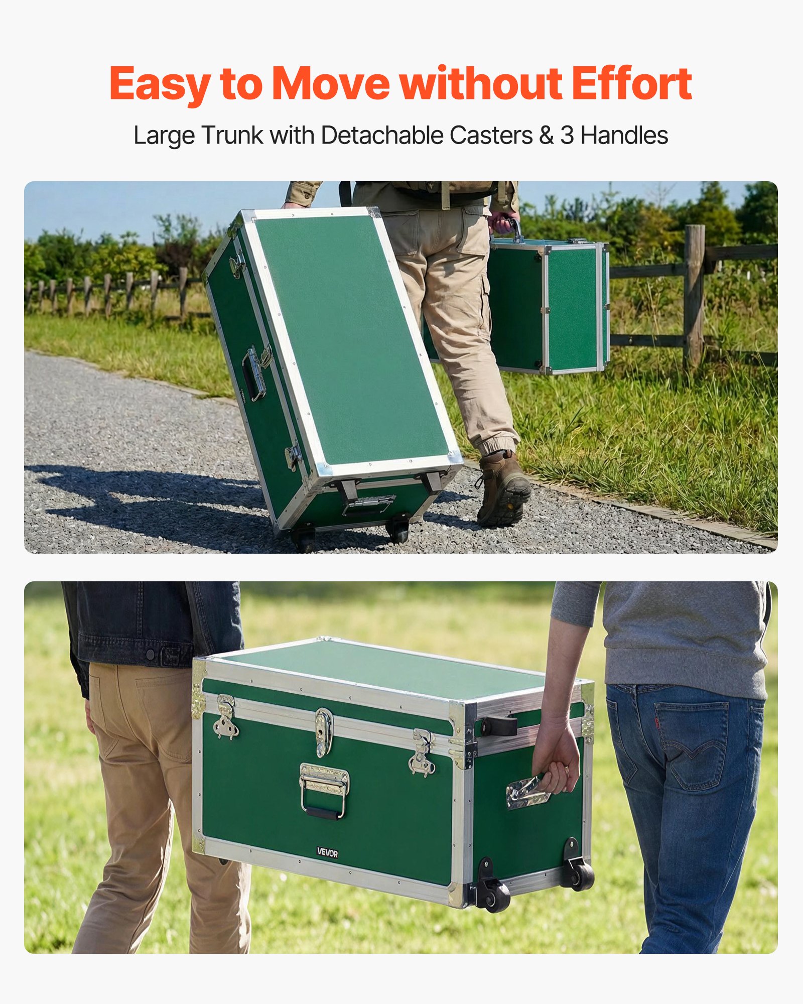 Casters & Three Handles: Large metal storage trunk has casters and three handles, easy for one person to push & pull, easy for two people to carry with less effort