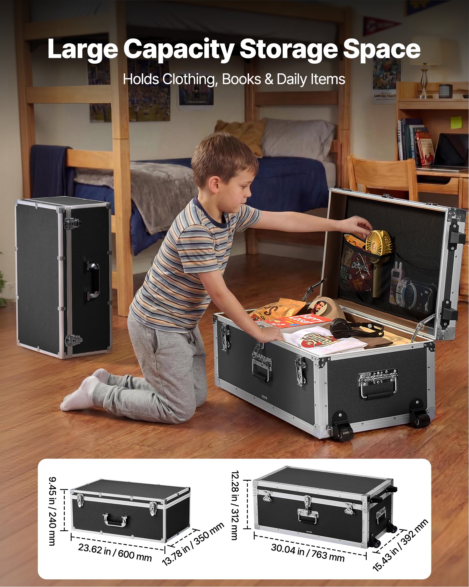 Large Capacity Storage: Large storage trunk size 30.04 x 15.43 x 12.28 in / 763 x 392 x 312 mm; small storage trunk size 23.62 x 13.78 x 9.45 in / 600 x 350 x 240 mm; roomy space for clothing, books, school supplies, and daily items