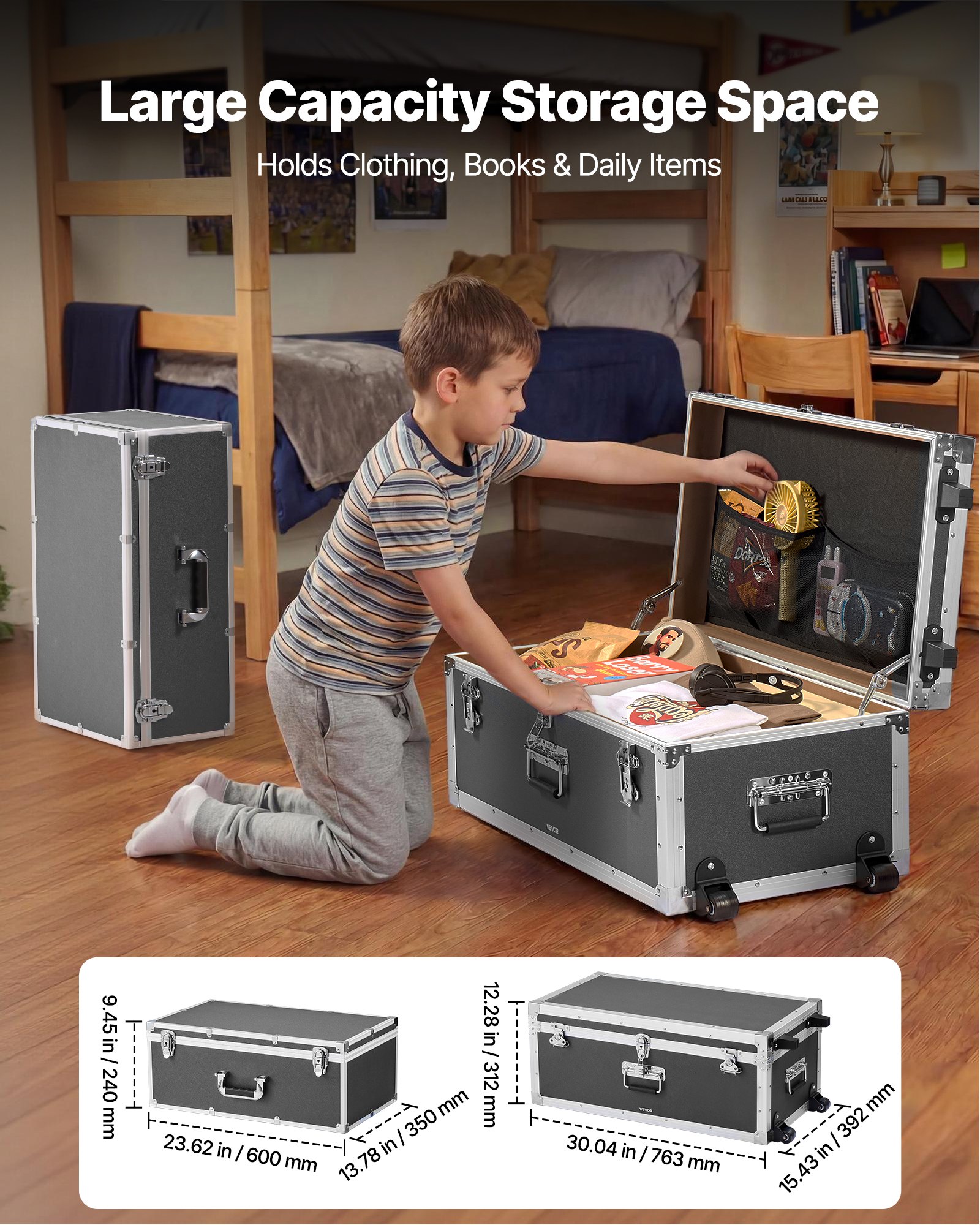 Large Capacity Storage: Large storage trunk size 30.04 x 15.43 x 12.28 in / 763 x 392 x 312 mm; small storage trunk size 23.62 x 13.78 x 9.45 in / 600 x 350 x 240 mm; roomy space for clothing, books, school supplies, and daily items