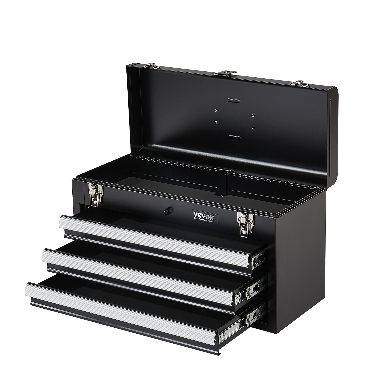 Features & Details Ample Storage Space: The portable metal tool box measures 20.5 x 8.6 x 12 inches and weighs 17.86 lbs, making it ideal for carrying tools while working on the go or storing them in your vehicle's trunk. It features 1 top box (19.9 x 8.2 x 2.1 inches) and 3 drawers (17.6 x 7.36 x 1.73 inches), with each layer supporting up to 15 lbs, providing plenty of storage space. Auto-locking for Enhanced Security: The steel tool box features an auto-locking system. Simply push the drawers in and close the top lid to lock it, avoiding accidental sliding and securing your tools. The heavy-duty metal latch keeps the top securely in place, while an additional lock hole allows you to add a lock for extra security, ensuring your valuable items are secure. (Note: To access the drawers, unlock by opening the top lid first.) Smooth Operation for Easy Access: Opening the meta tool box becomes a smooth, effortless action with the well-designed hinge and tight-fitting lid providing splash protection. Each drawer is equipped with dual ball-bearing tracks for smooth, stable sliding, making it easy to pull out without worrying about getting stuck. The built-in EVA padding absorbs vibrations and avoids scratching or collisions, keeping everything secure and quiet. Portable and Easy to Carry: With a convenient top handle, the drawer toolbox is easy to carry even when full of tools. The auto-locking system ensures your items stay secure during transport, avoiding any accidental spills and keeping you organized while on the move. Sturdy and Durable: Constructed from upgraded 0.6mm thick steel, this toolbox with drawers is built to last, providing high resistance to deformation and impact. The powder-coated surface significantly enhances rust resistance, making it ideal for tough environments. The smooth metal surface is also easy to clean and maintain, providing hassle-free usage.