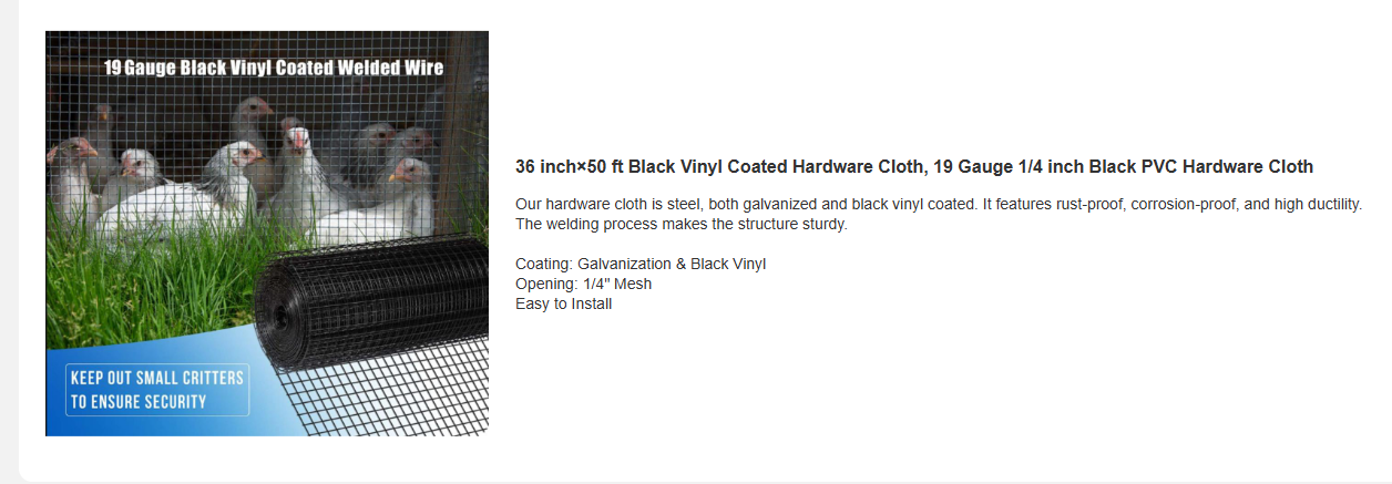 Product Name:36 inch×50 ft Black Vinyl Coated Hardware Cloth 19 Gauge 1/4 inch Black PVC Hardware Cloth, Black Welded Wire Fence Supports Poultry-Netting Cage-Home Improvement and Chicken Coop