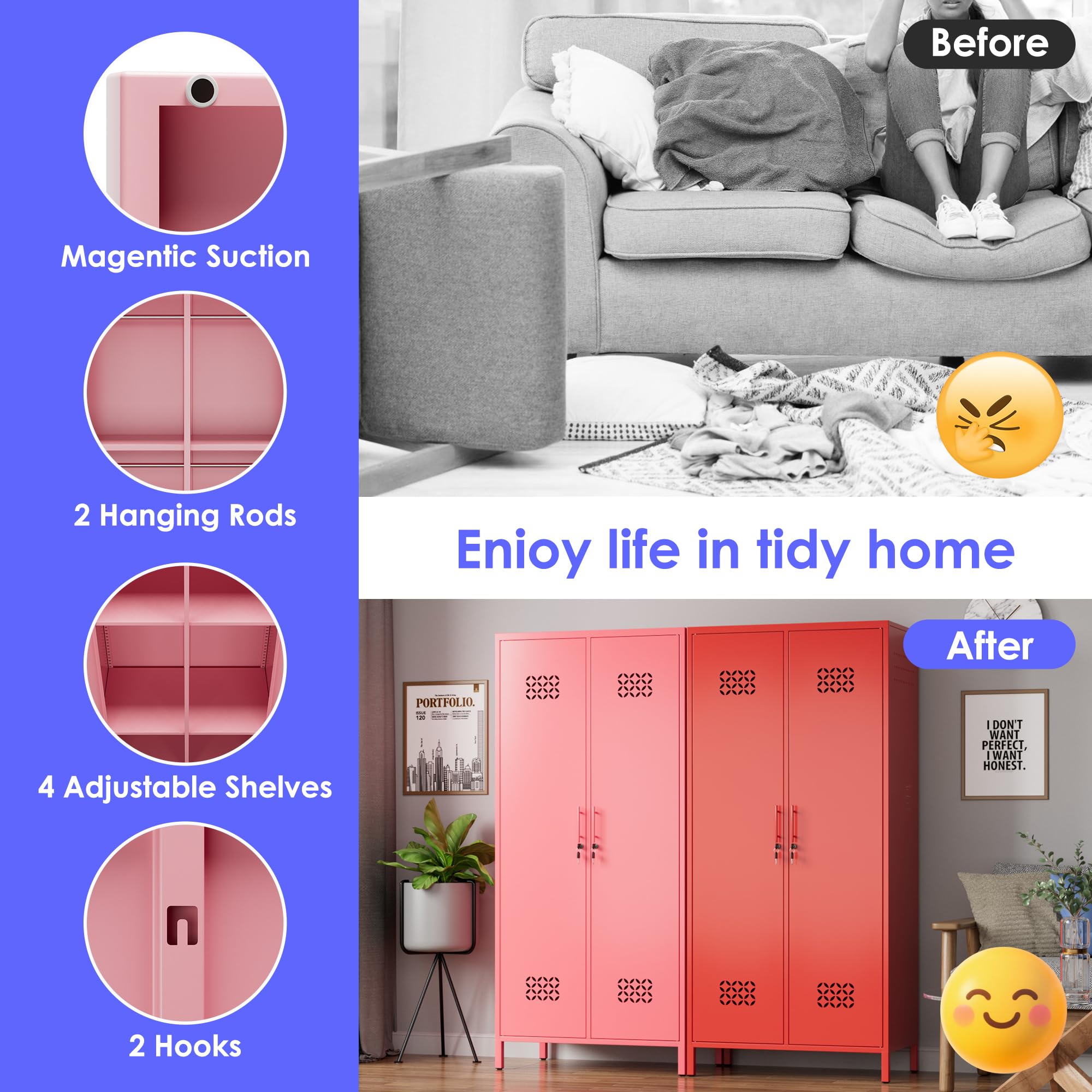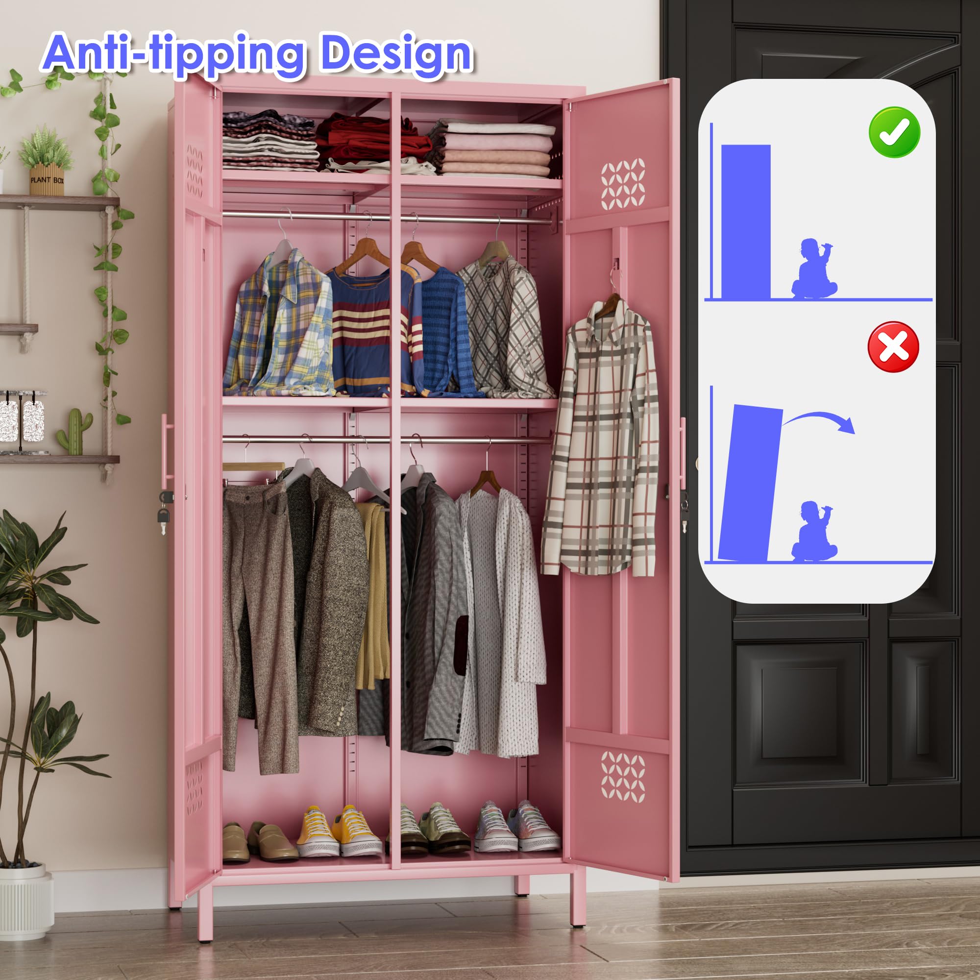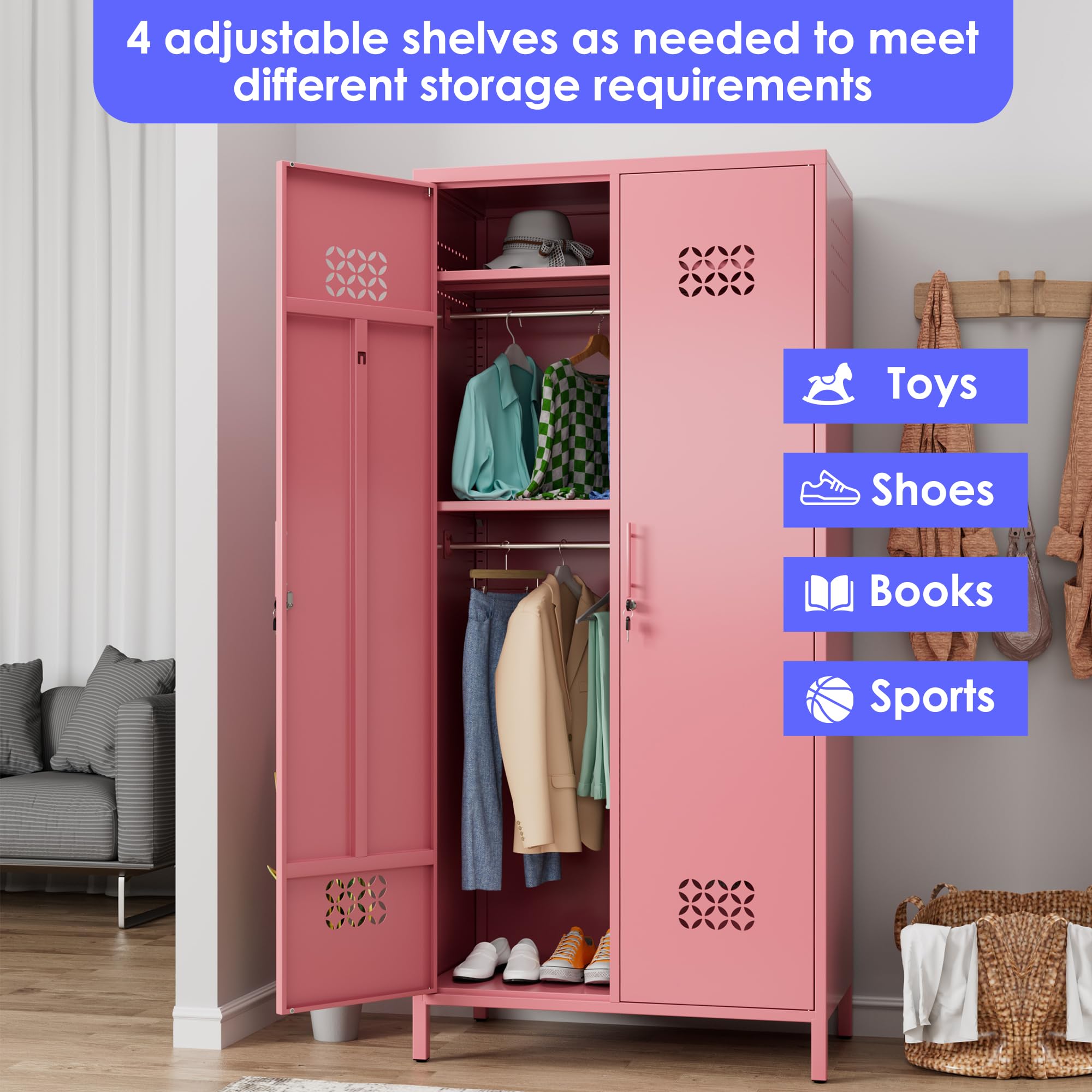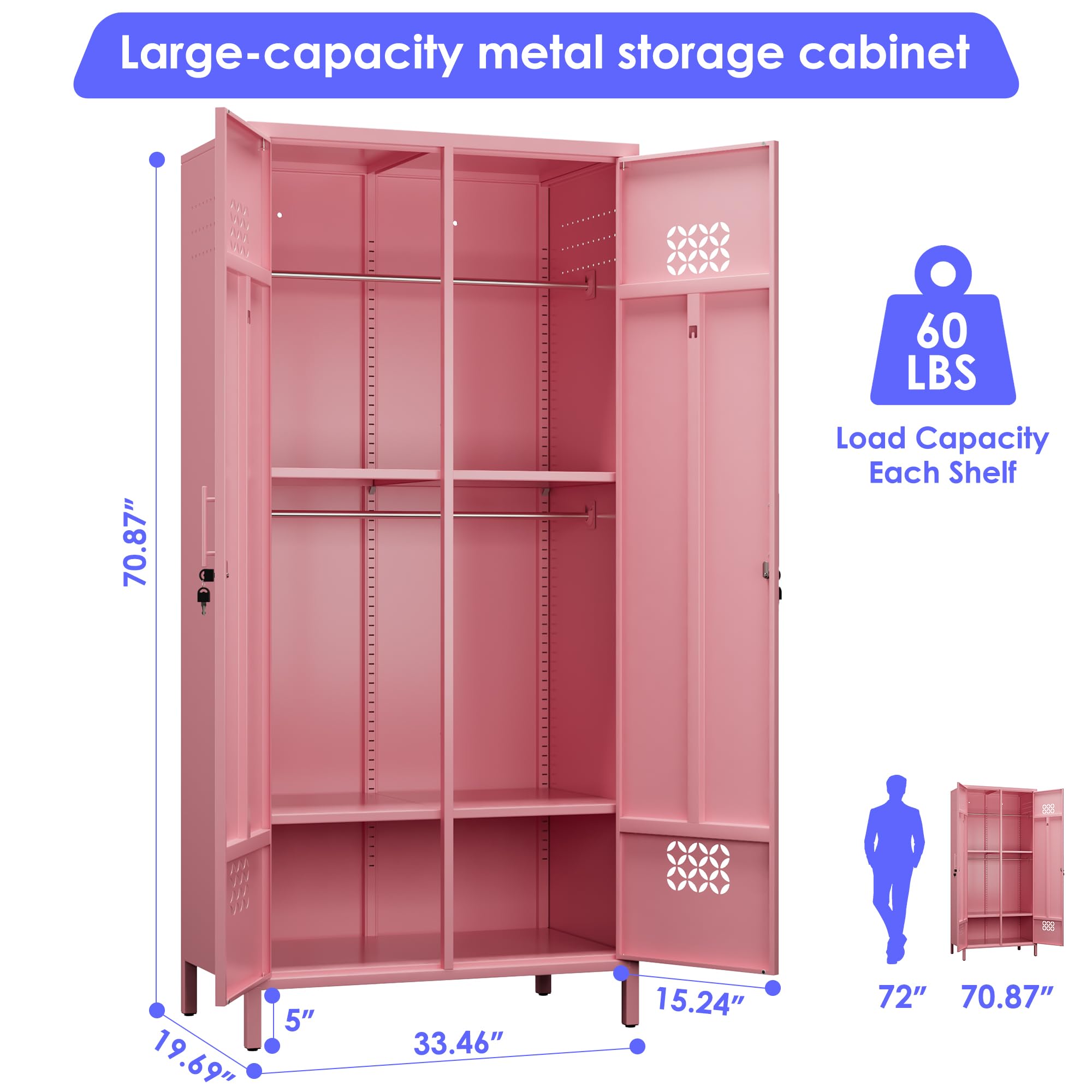 METAN 71inch Hx33.5inch Wx20inch D Metal Wardrobe Closet With Lock,Extra Deep 2 Doors Metal Wardrobe Cabinet For Home,Assembly Required,Pink