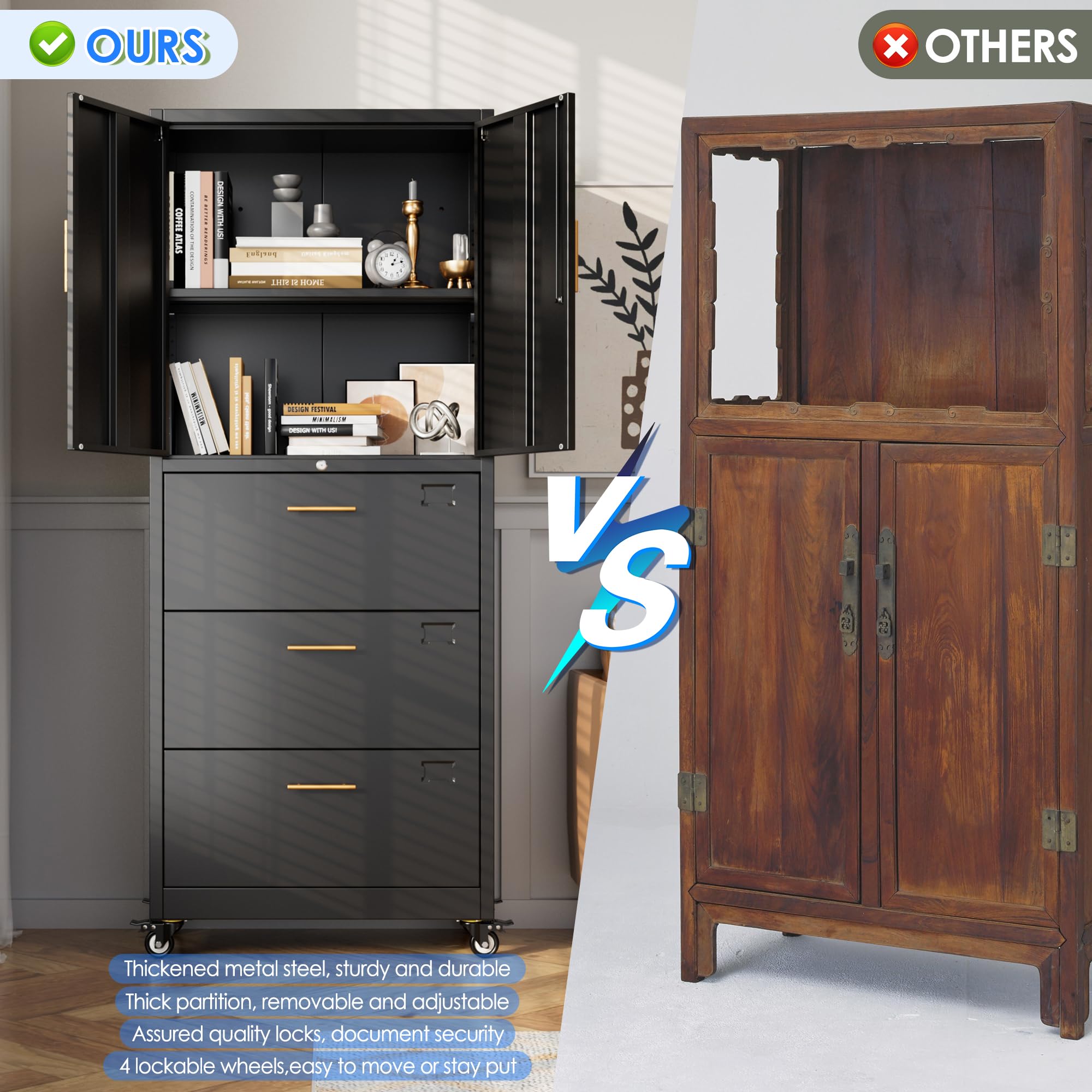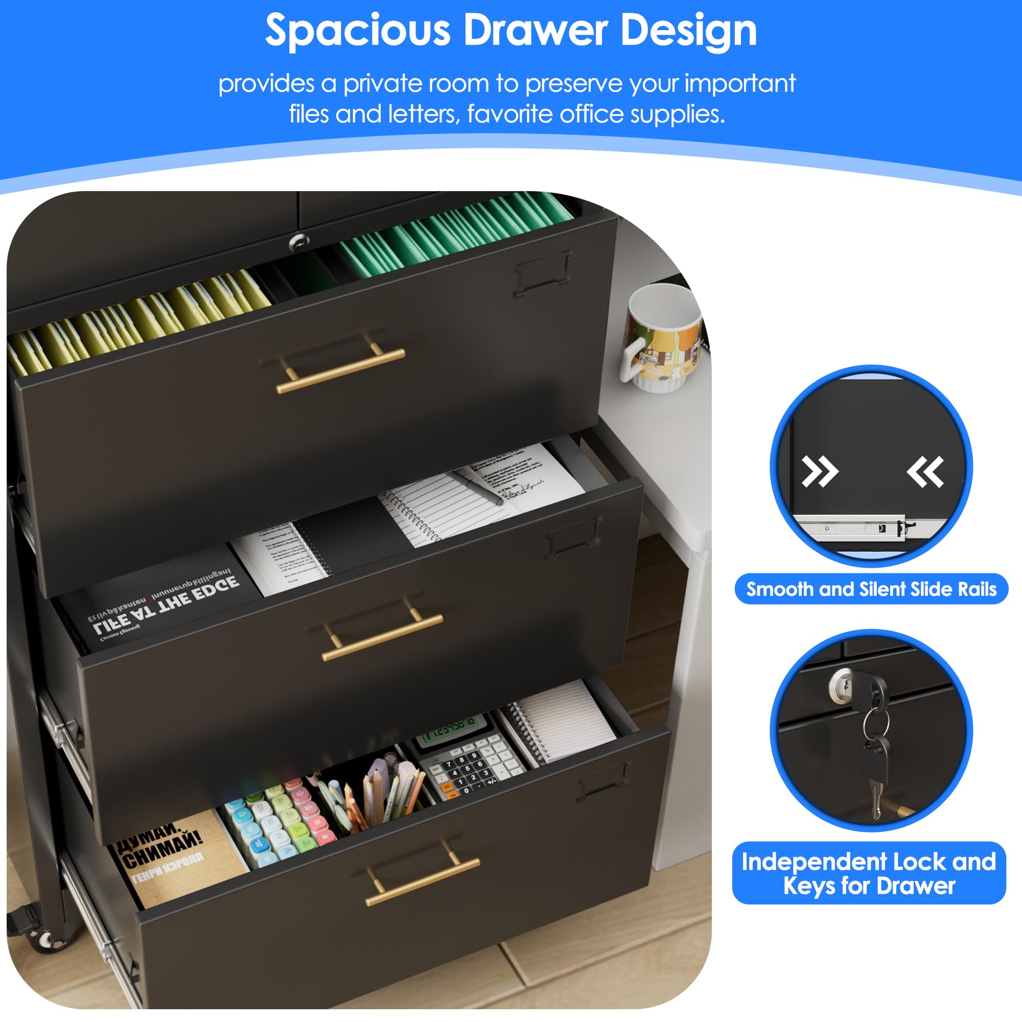 METAN Metal File Cabinet With 3 Drawers And 1 Shelves,Office Filing Cabinet On Wheels With Lock,Office Storage For Letter Legal Size,Assembly Required,Black