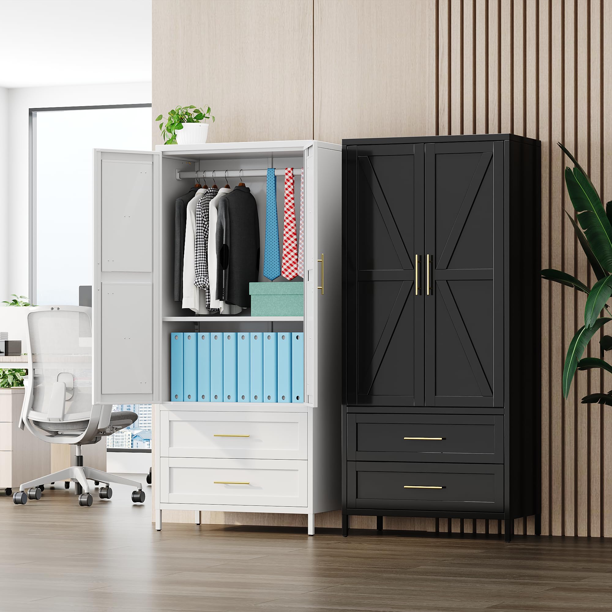 • 【Sturdy and Higher Quality】Wardrobe closet with drawer 100% steel material is made into metal armoire wardrobe closet, powder coating process makes storage locker sturdy and higher quality. 2 metal handles make it easy to open and close the door. Metal wardrobe cabinet for years in your home office.