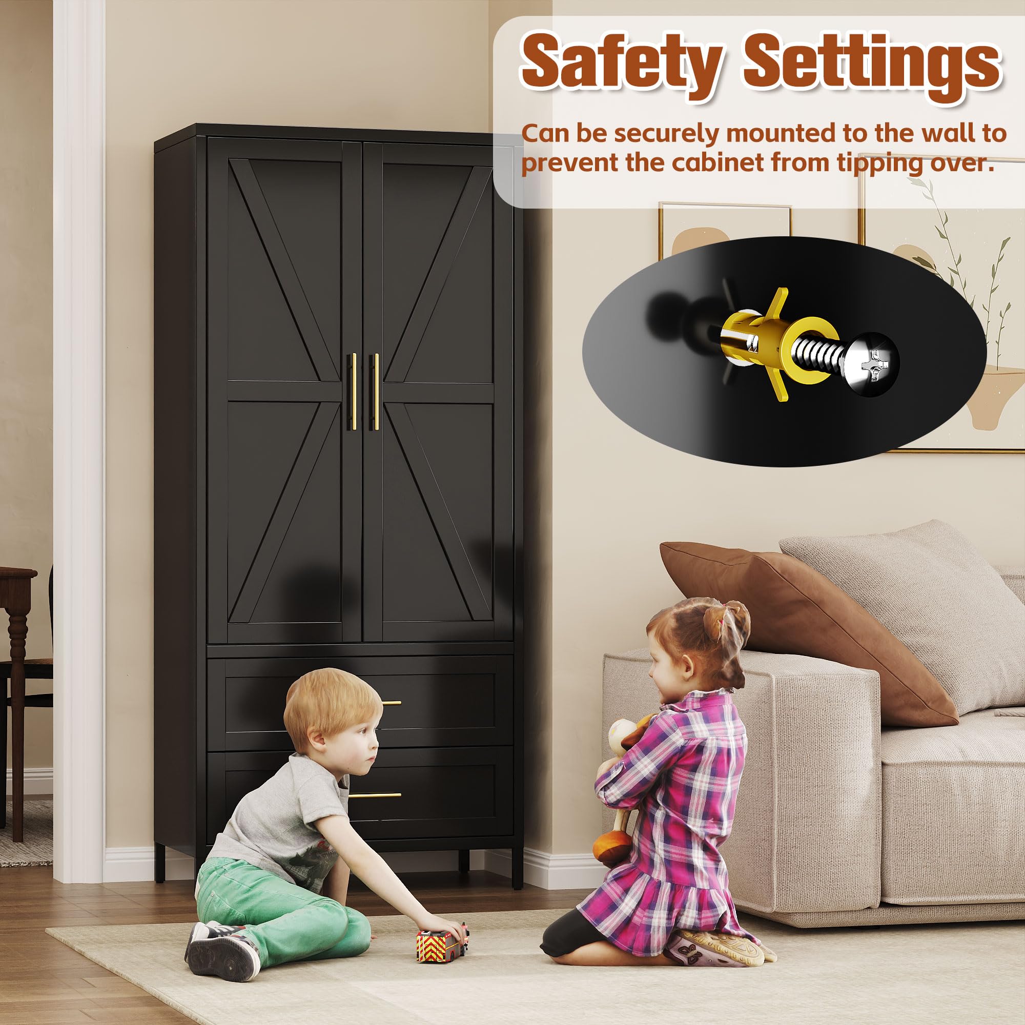 • 【Unique Design】 Metal wardrobe closet with 1 adjustable shelves and 1 hannging rod,and 1 drawer metal wardrobe closet can meet your needs for storing different sized items and meet most of your daily needs. The doors of wardrobe is fitted with strong magnetic closures to ensure they stay securely closed. the wardrobe cabinet also features an anti-tilt design with pre-drilled holes on the back and to avoid accidental tipping.