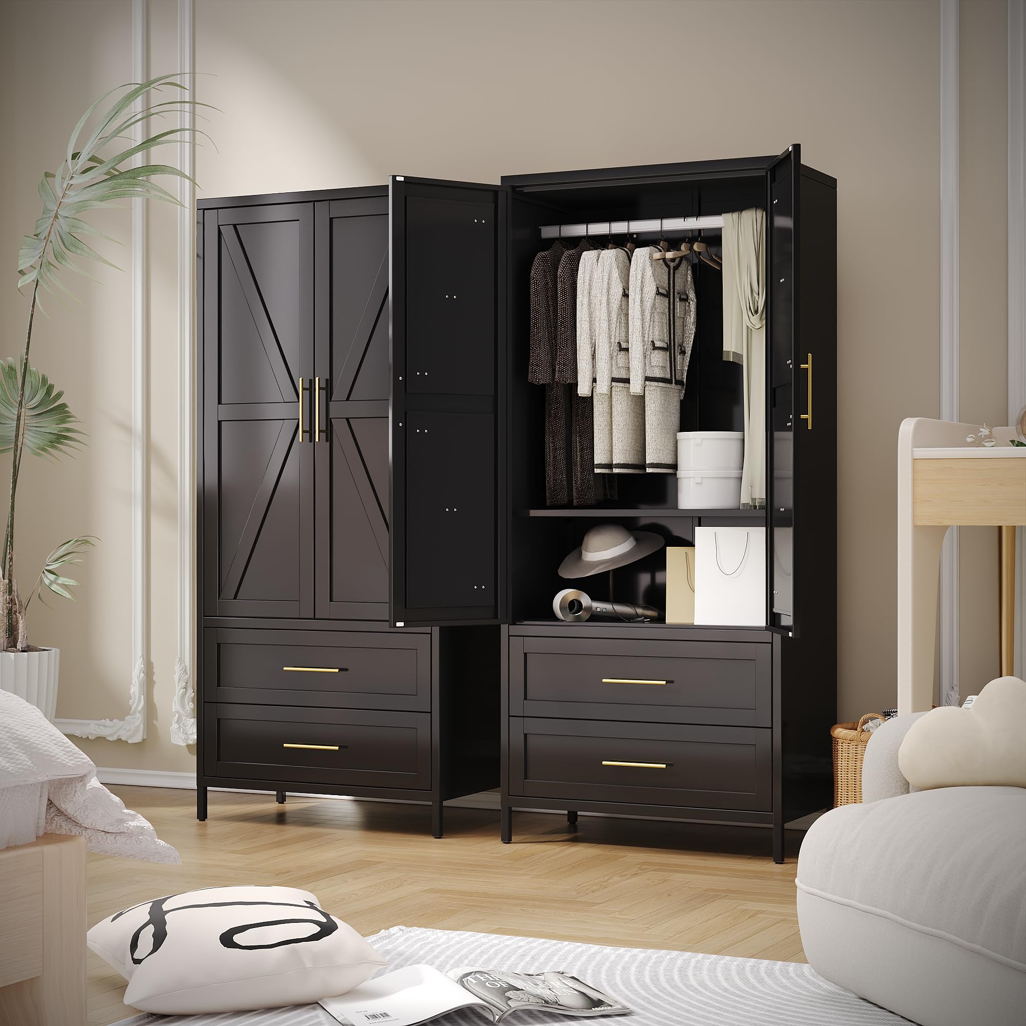METAN Metal Wardrobe Closet With Doors,Armoire Wardrobe Closet With 2 Drawers For Bedroom,Assembly Required,Black